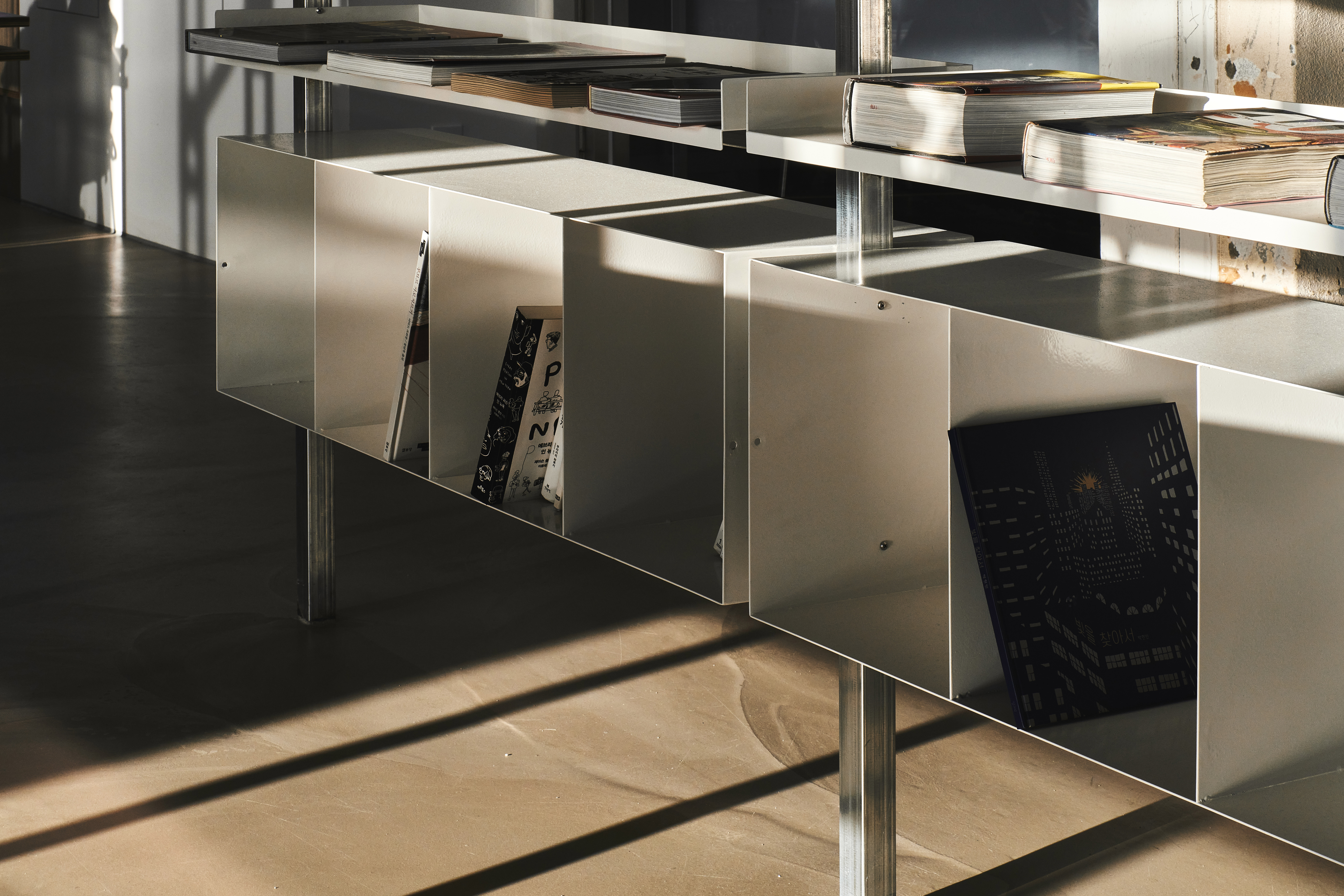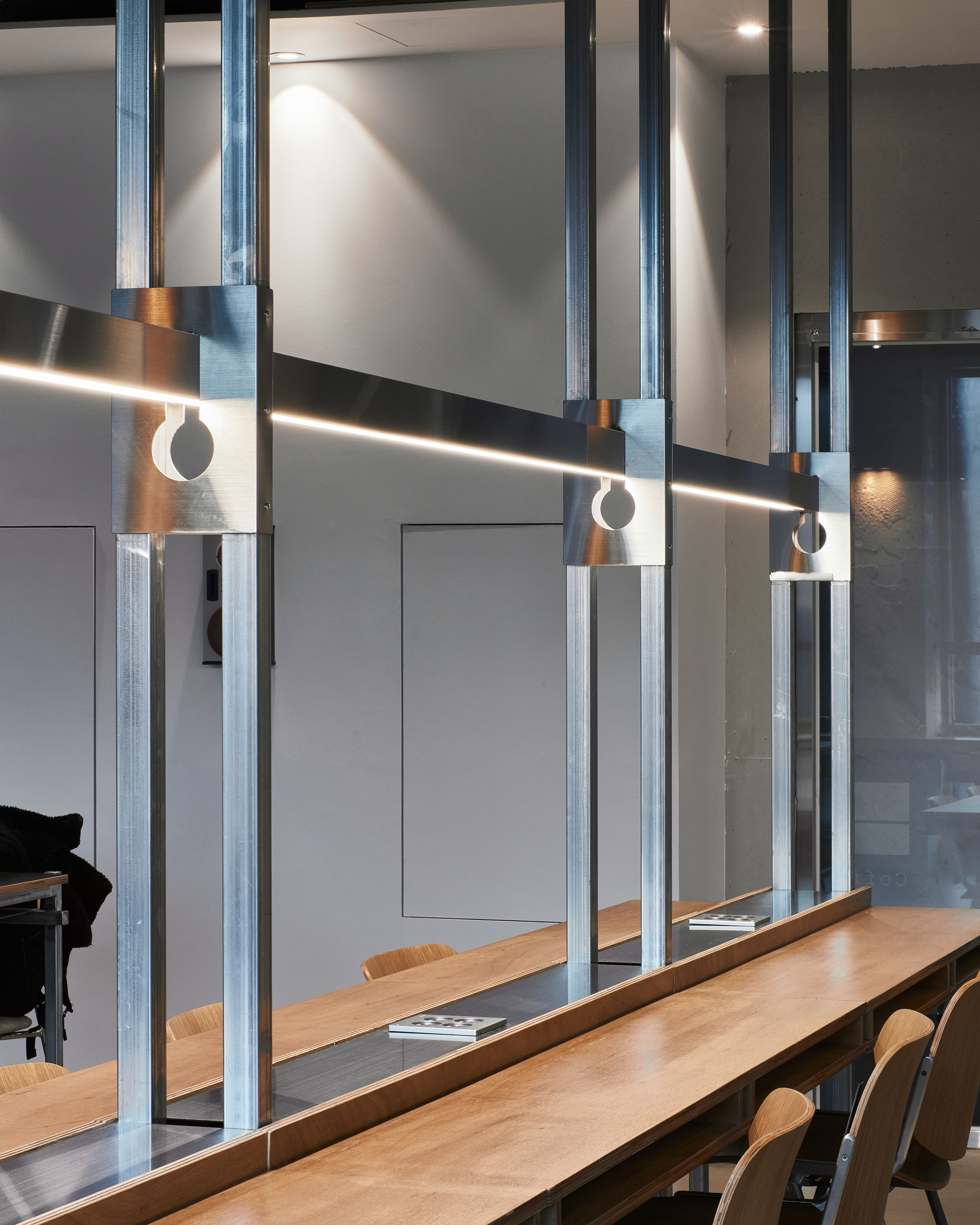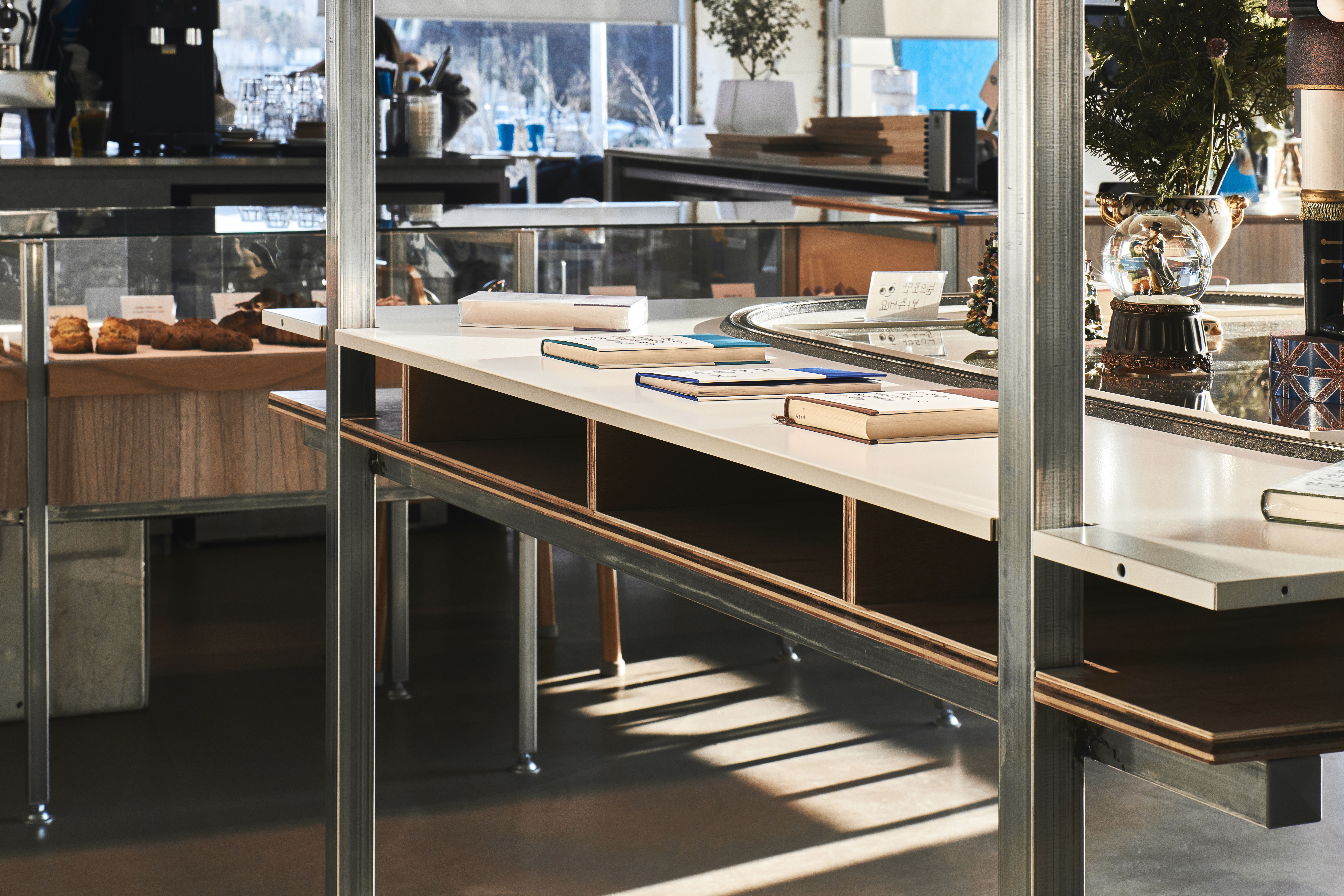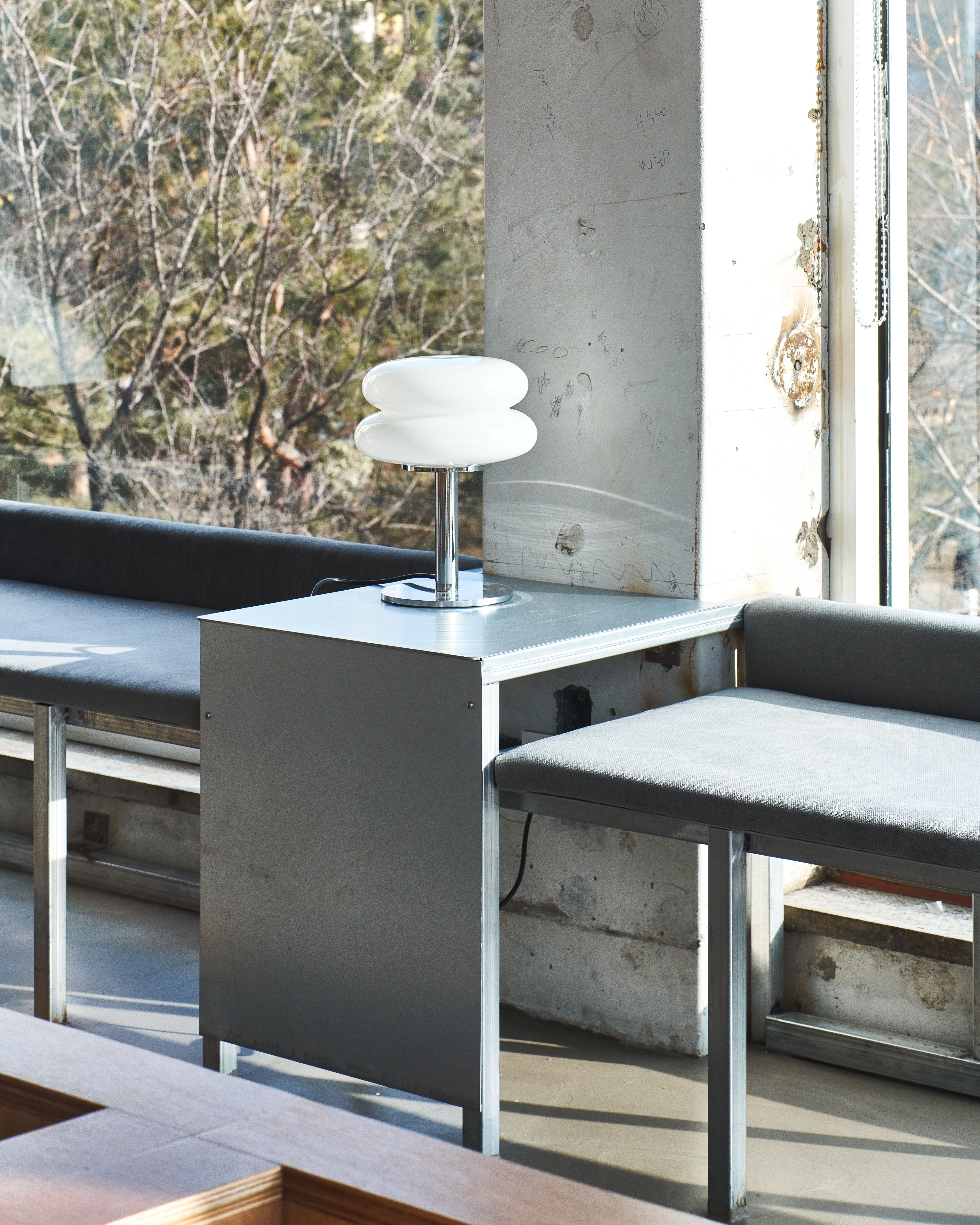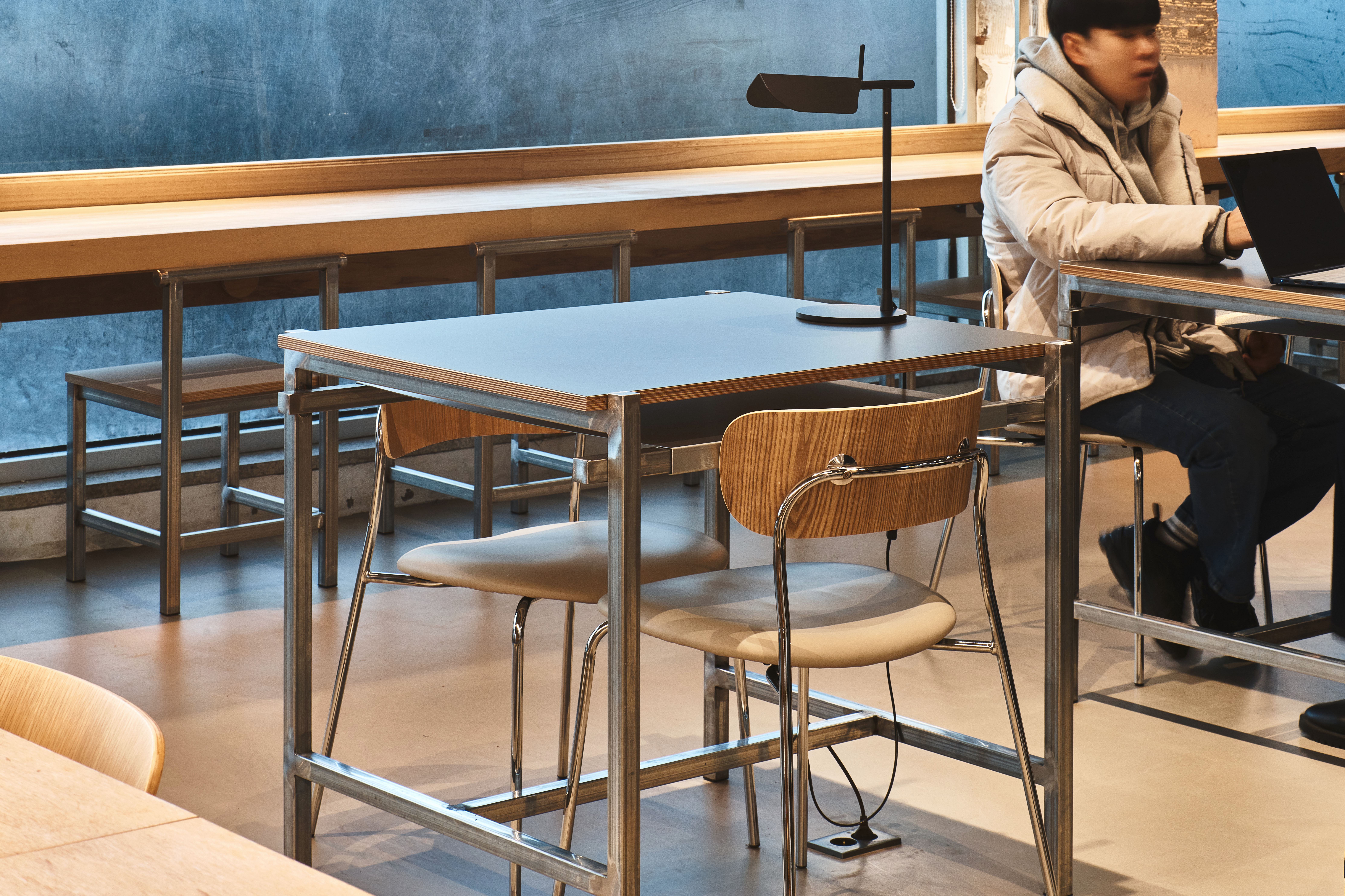 존재감이 강하지 않고 튼튼한 아연각관으로 뼈대를 세우고(주로 정글짐과 같은 격자구조) 여기에 나무, 금속으로 된 제작물이 결합하면서 전시대, 카운터, 선반으로의 기능을 하게 됩니다. 이것은 후에 필요에 따라 해체되고 다른 걸로 교체 될지도 모르겠습니다. 고정되지 않은 각관 구조에도 패브릭과 상판이 결합하여 테이블과 의자가 됩니다. 처음 인상적이었던 대로변 창가를 따라서는 20m 길이의 나무로 만든 면이 기둥사이로 끼어 들어가 바깥 풍경을 바라보며 작업할 수 있는 기다란 테이블이 되었습니다. 그저 단순한 구조물처럼 보이는 이 기다란 나무판도 탁상조명과 의자에 의해 훌륭한 작업 테이블로 사용됩니다.
