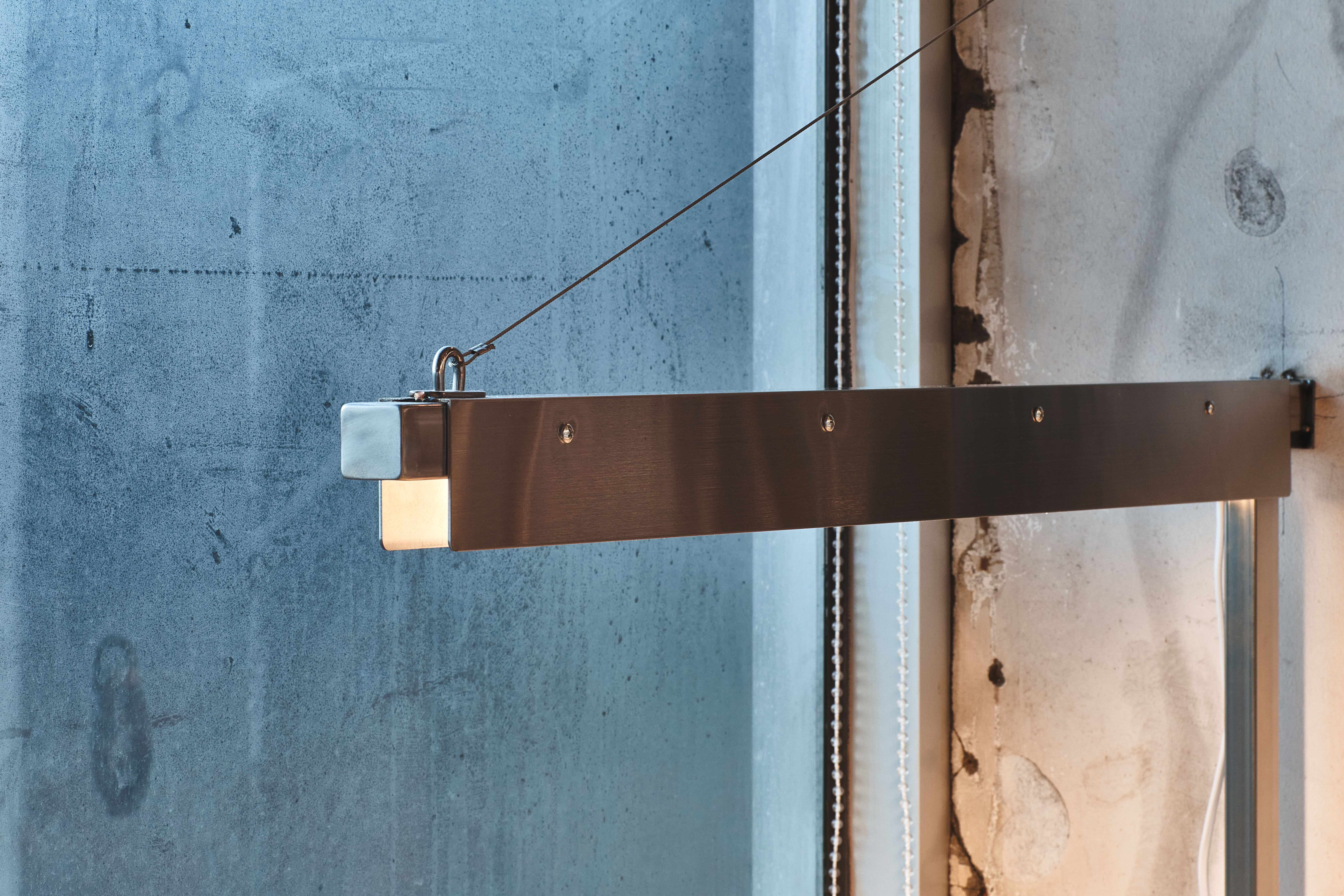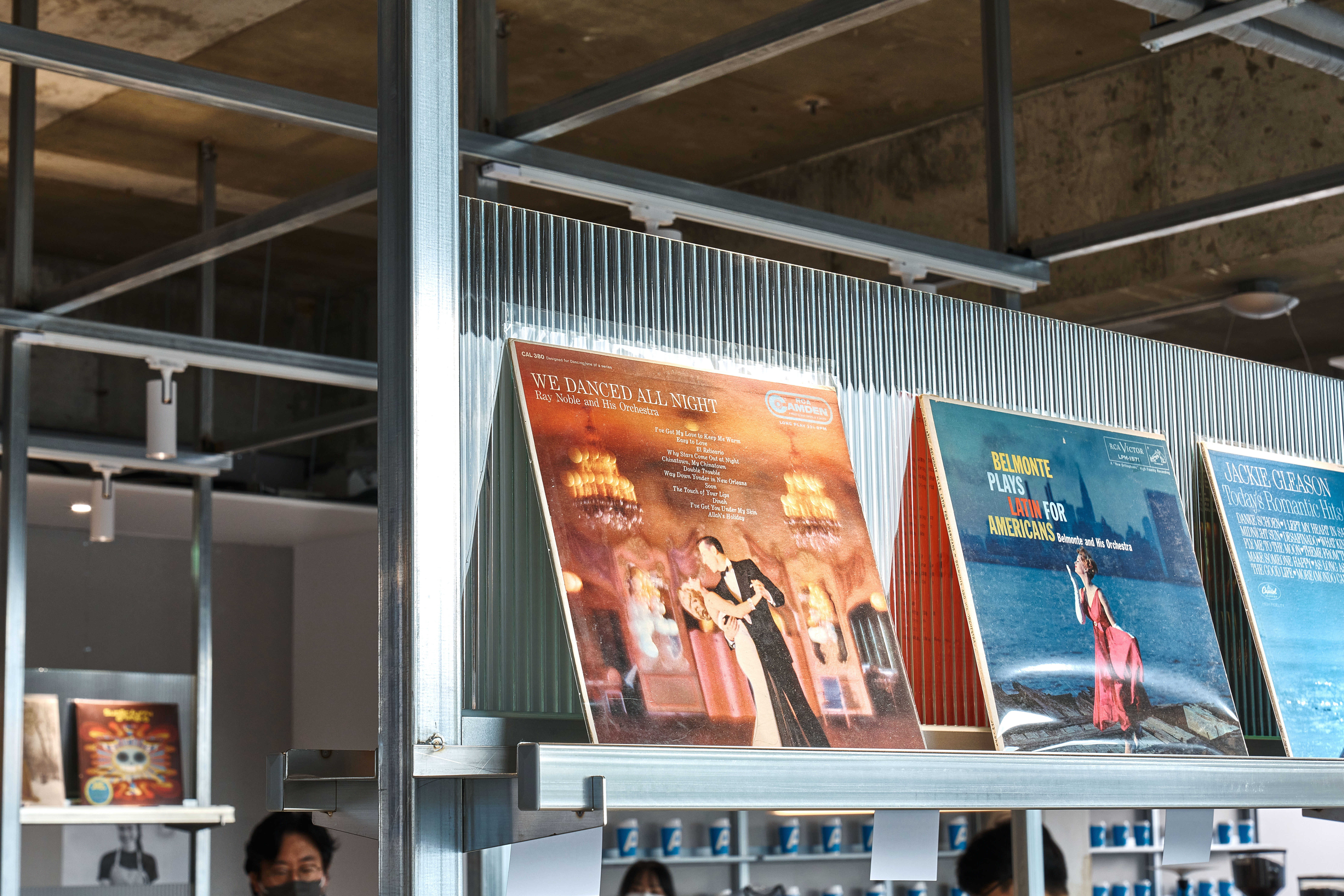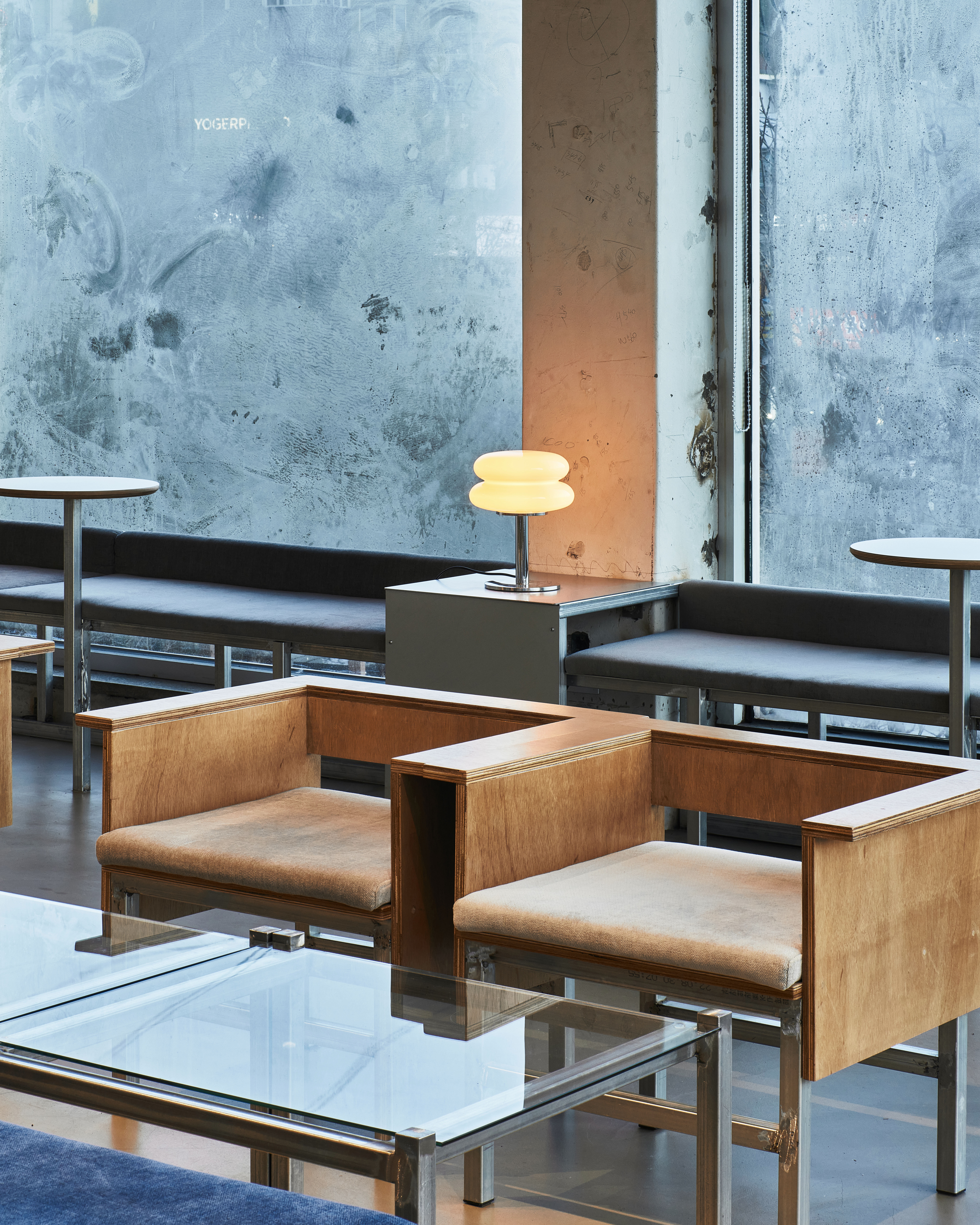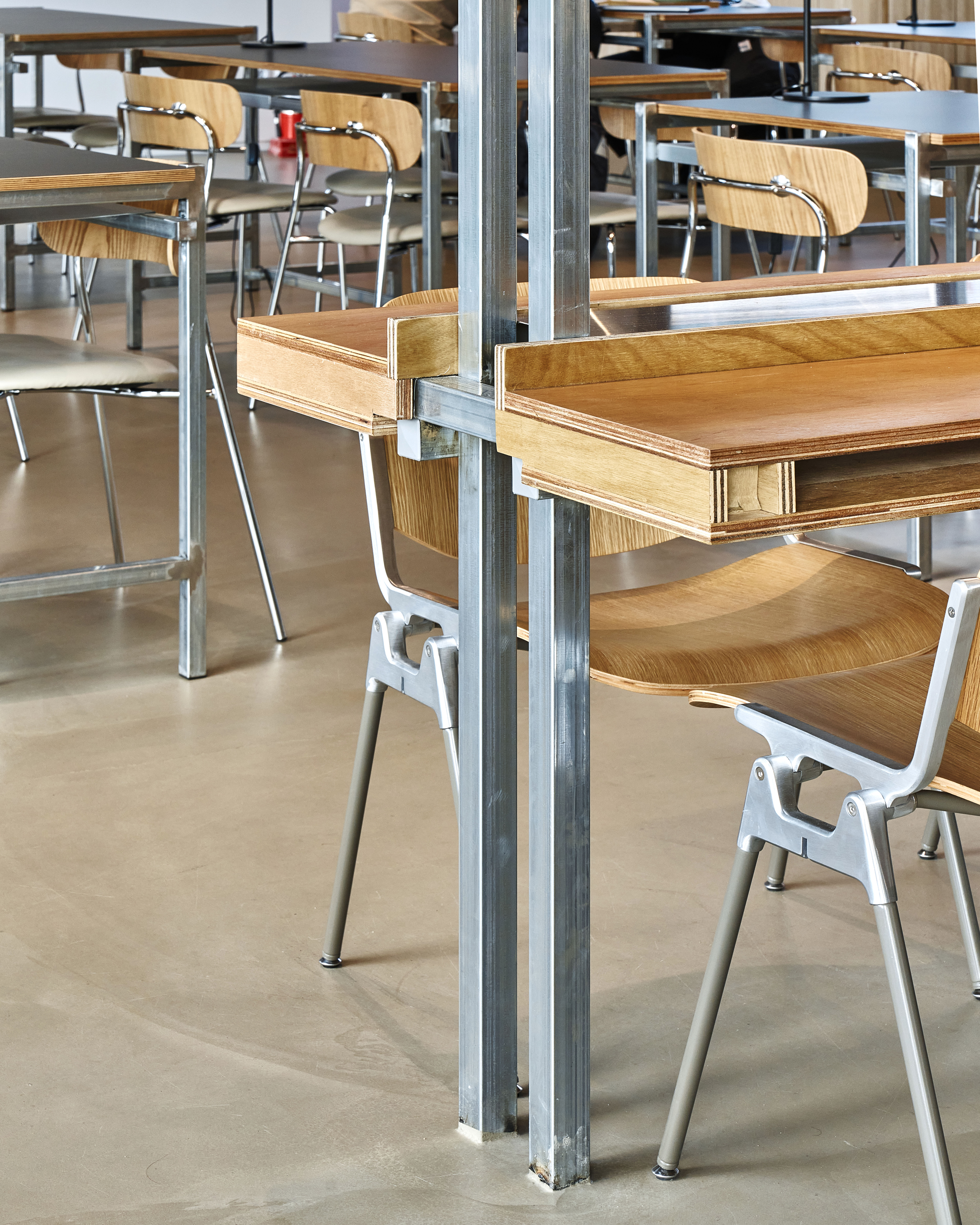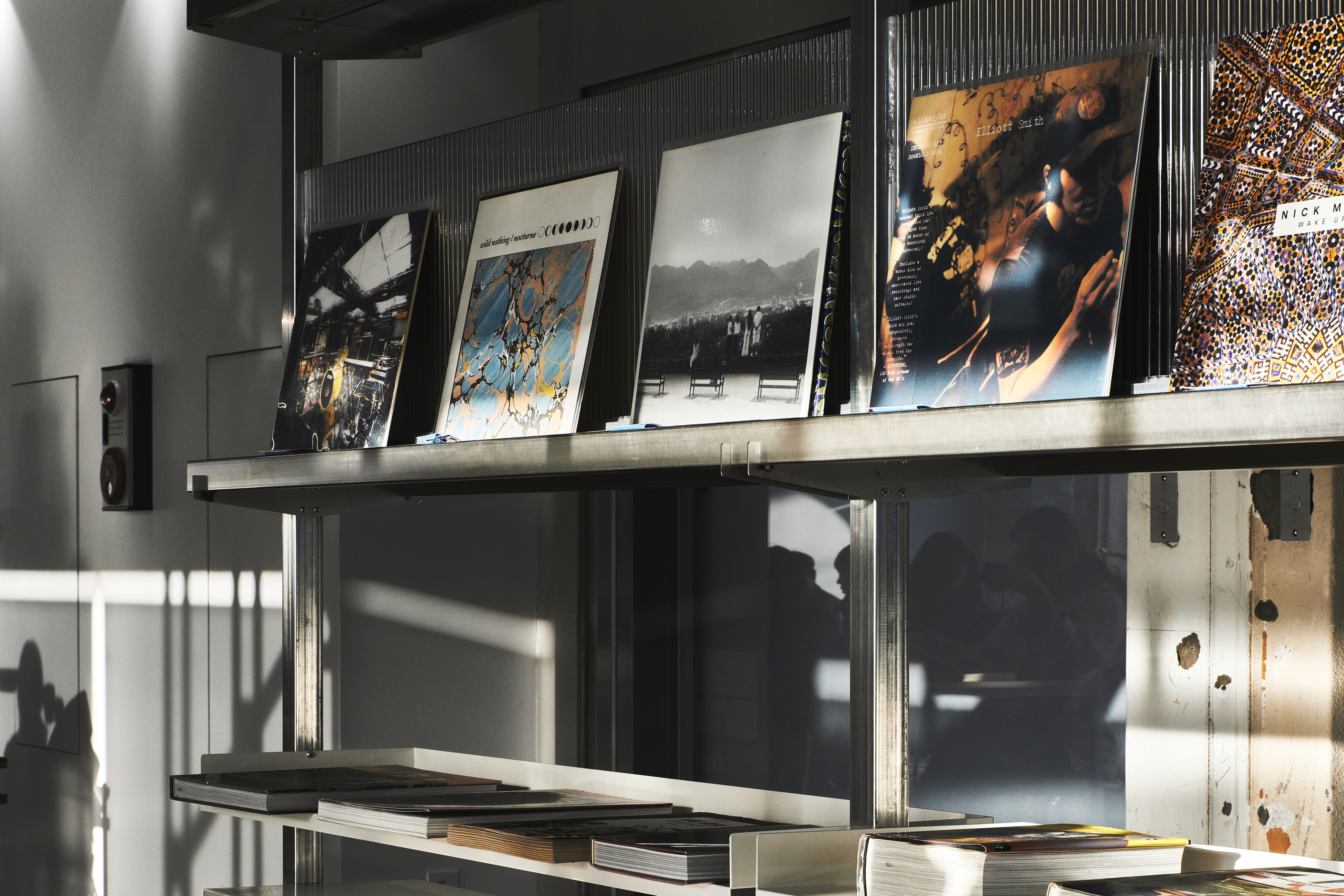 존재감이 강하지 않고 튼튼한 아연각관으로 뼈대를 세우고(주로 정글짐과 같은 격자구조) 여기에 나무, 금속으로 된 제작물이 결합하면서 전시대, 카운터, 선반으로의 기능을 하게 됩니다. 이것은 후에 필요에 따라 해체되고 다른 걸로 교체 될지도 모르겠습니다. 고정되지 않은 각관 구조에도 패브릭과 상판이 결합하여 테이블과 의자가 됩니다. 처음 인상적이었던 대로변 창가를 따라서는 20m 길이의 나무로 만든 면이 기둥사이로 끼어 들어가 바깥 풍경을 바라보며 작업할 수 있는 기다란 테이블이 되었습니다. 그저 단순한 구조물처럼 보이는 이 기다란 나무판도 탁상조명과 의자에 의해 훌륭한 작업 테이블로 사용됩니다.