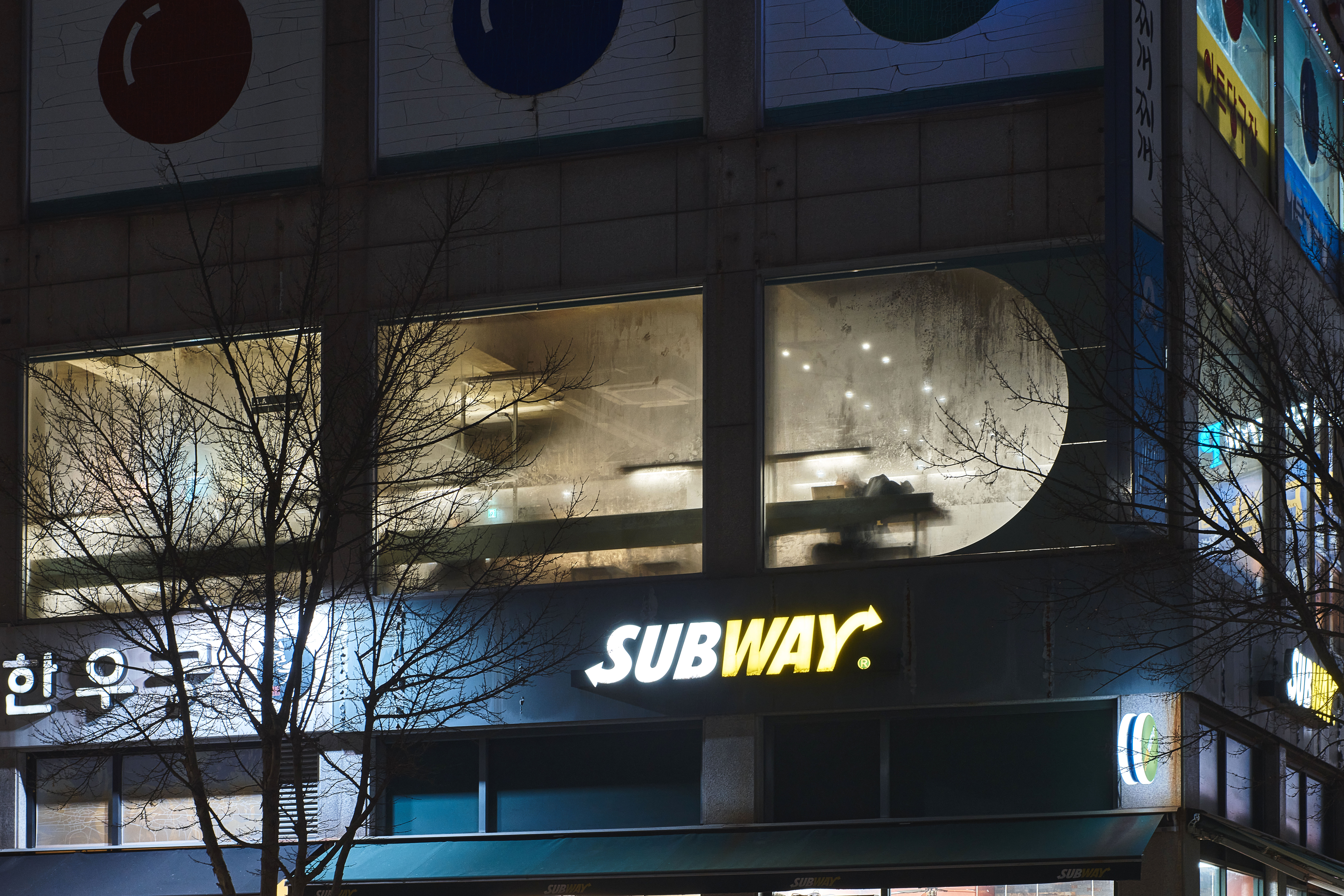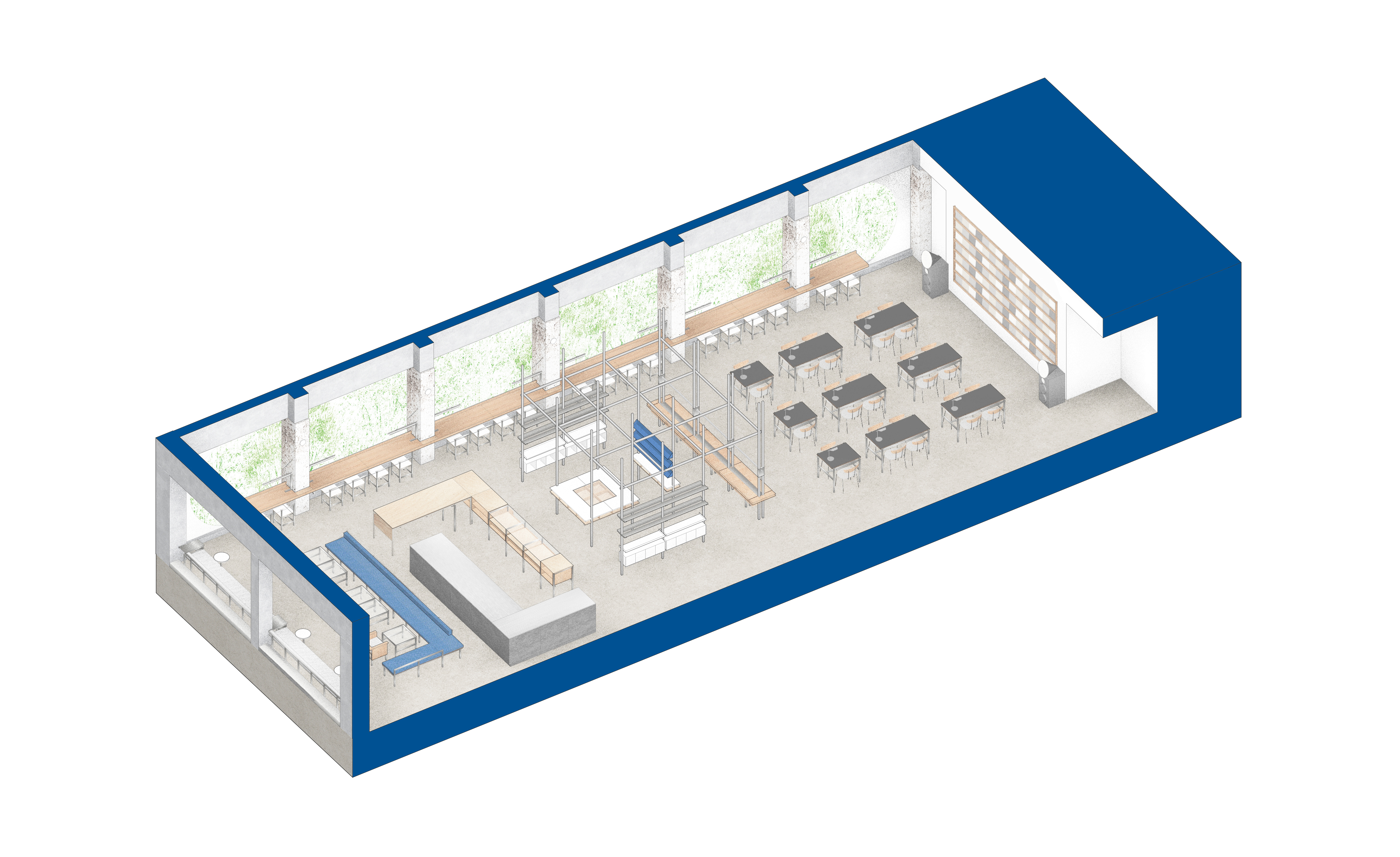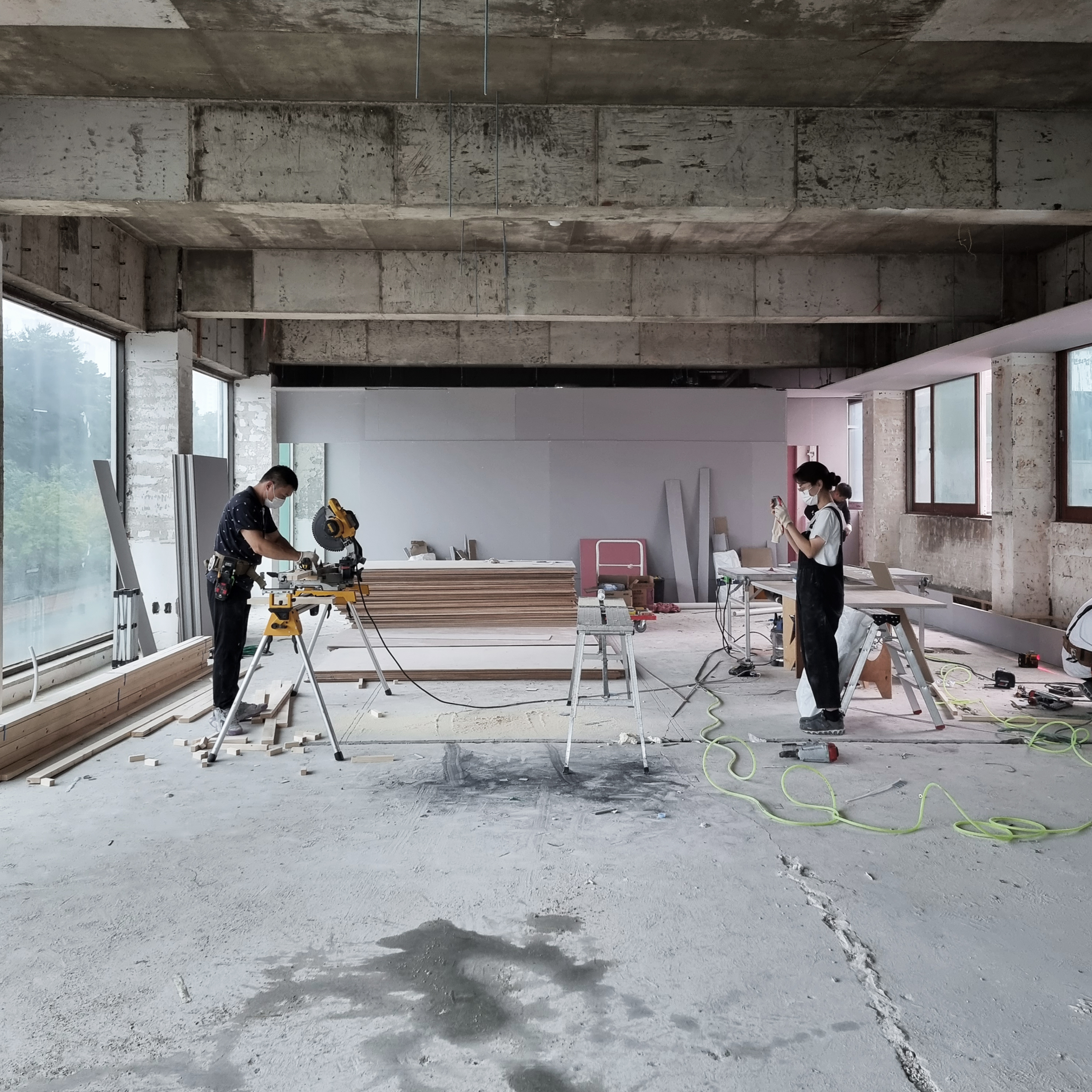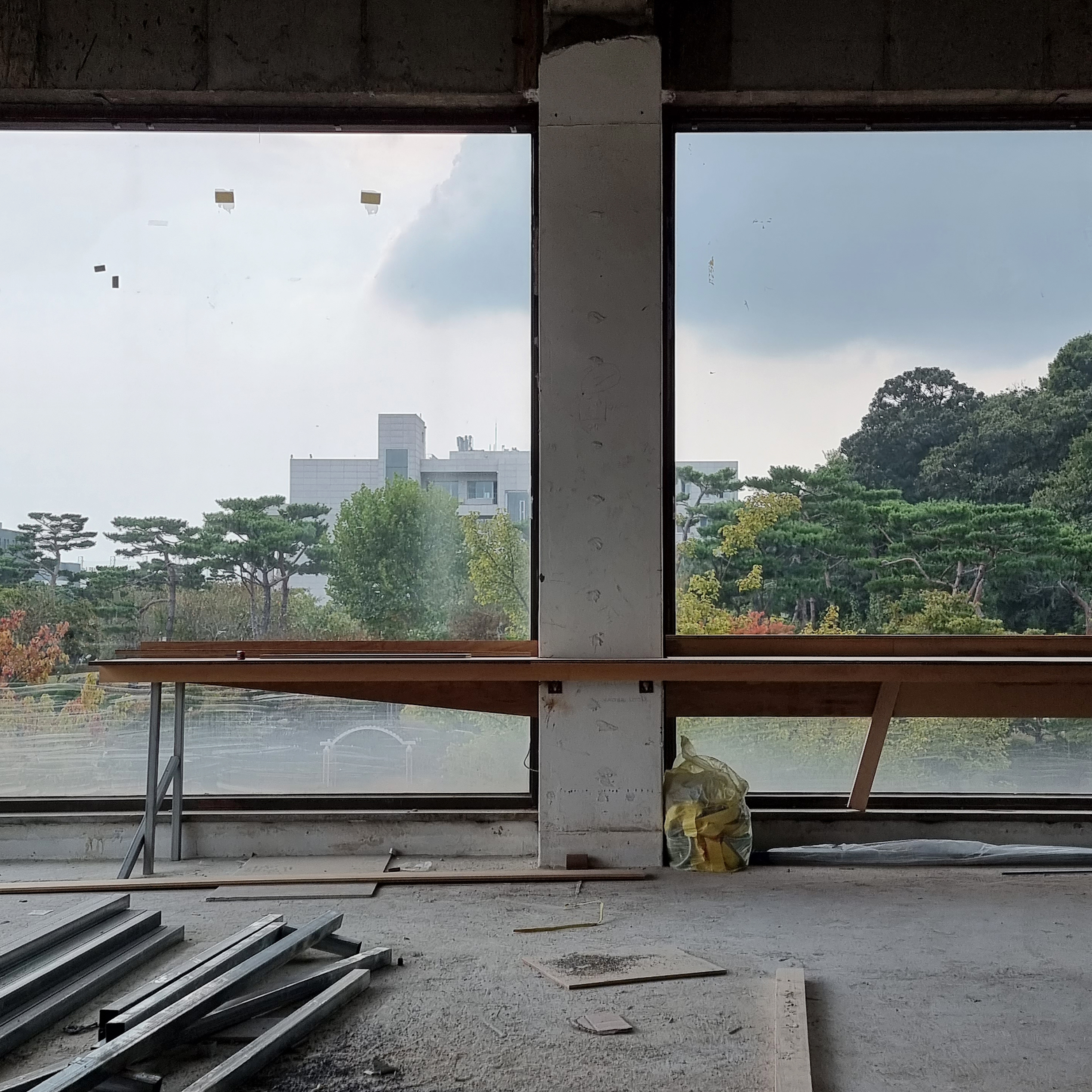 처음 현장을 마주했을 때, 방금 철거가 이루어진 실내는 바닥 천장 기둥 할 것 없이 사방이 콘크리트로 이루어진 기다란 직육면체 공간이었습니다. 공간의 긴 면 쪽으로 기둥이 쭉 늘어서 있었는데 기둥 사이로 한양대 에리카 캠퍼스의 짙은 녹색의 풍경이 보였습니다. 이 파노라마의 풍경은 계절에 따라 색을 달리하며 공간의 멋진 배경이 될것이 분명했습니다.