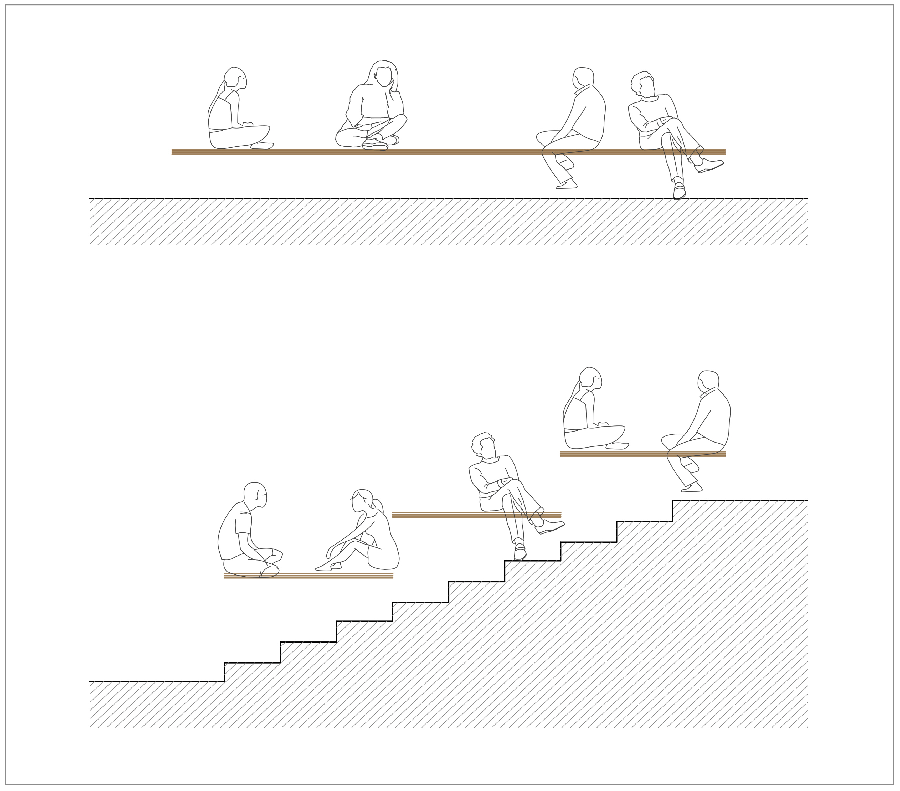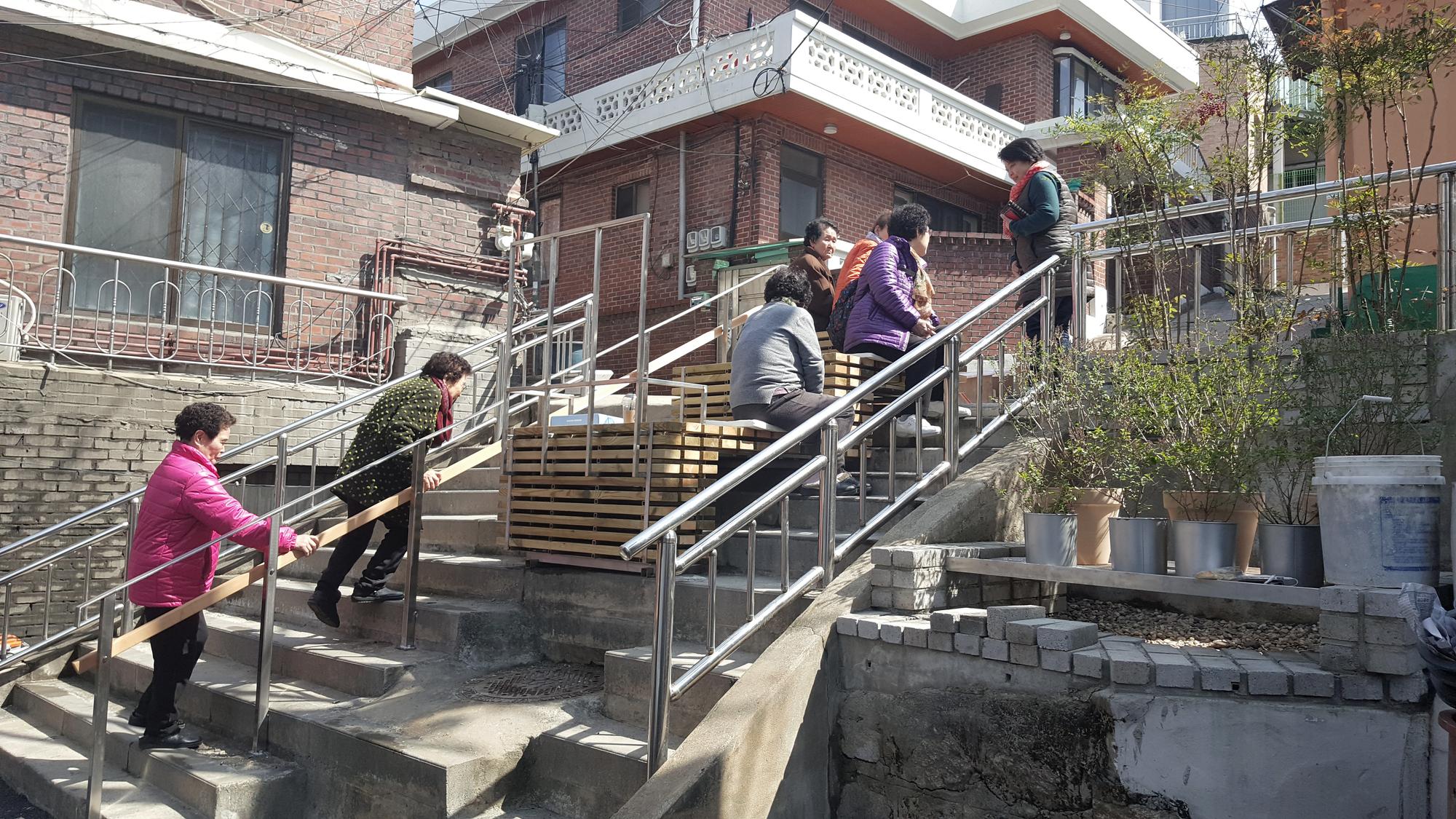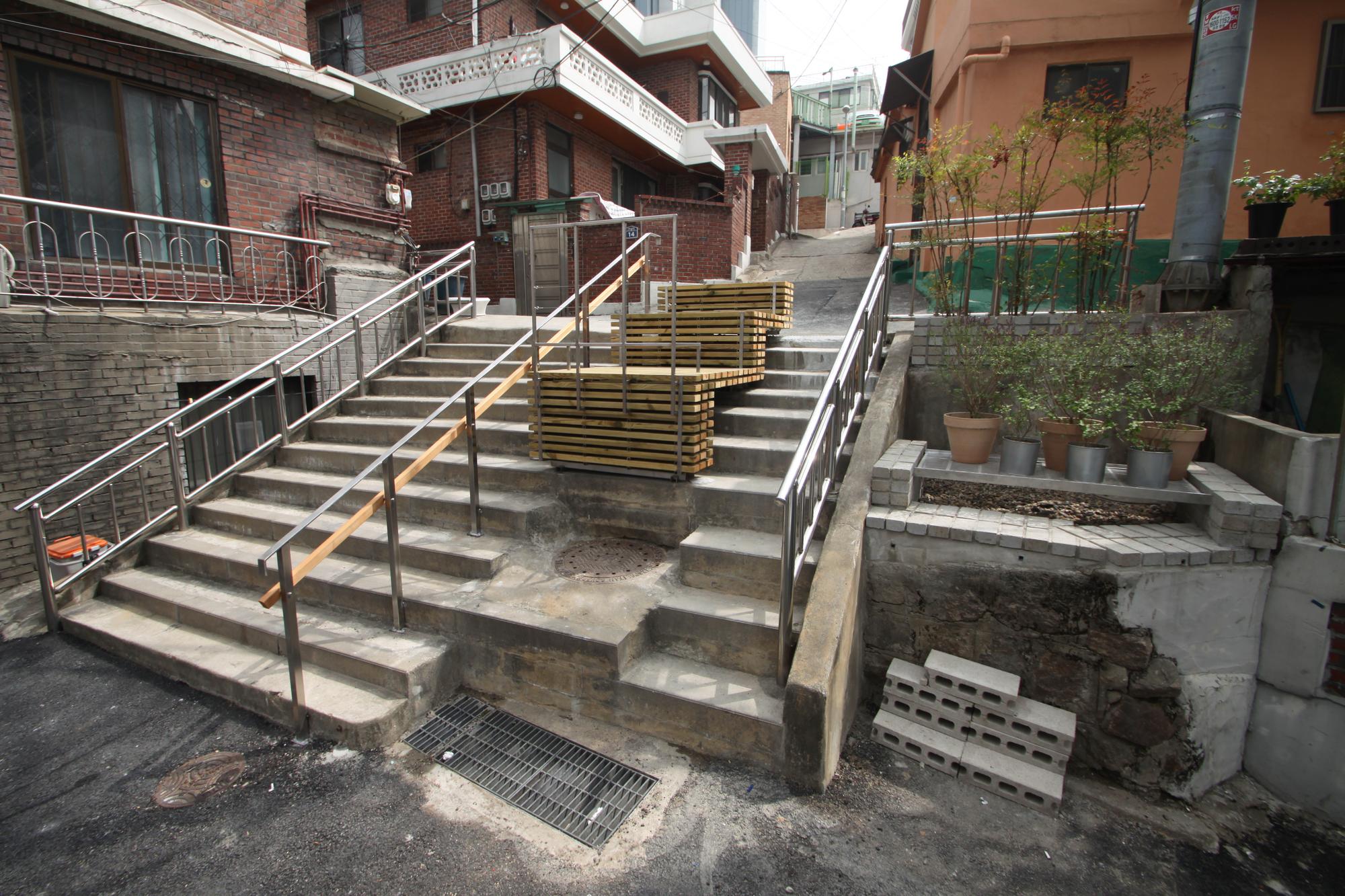 간이 쉽터가 있던 자리 그대로 새로운 쉼터를 만들었고, 계단 옆의 버려진 화단과 낡은 난간등 미관을 저해하는 요소들까지 손보았다. 쉼터는 평상의 개념이지만 계단의 단차를 따라 꺽여내려가 의자와 등받이 기능을 수행한다. 좌측의 난간은 차가운 손잡이를 대체할 목재 핸드레일이 노인분들의 키에 맞는 높이로 추가되었고, 반대편은 주민들이 함께 관리하기로 합의한 작은 화단과 화분대가 골목길에 생기를 더한다.
