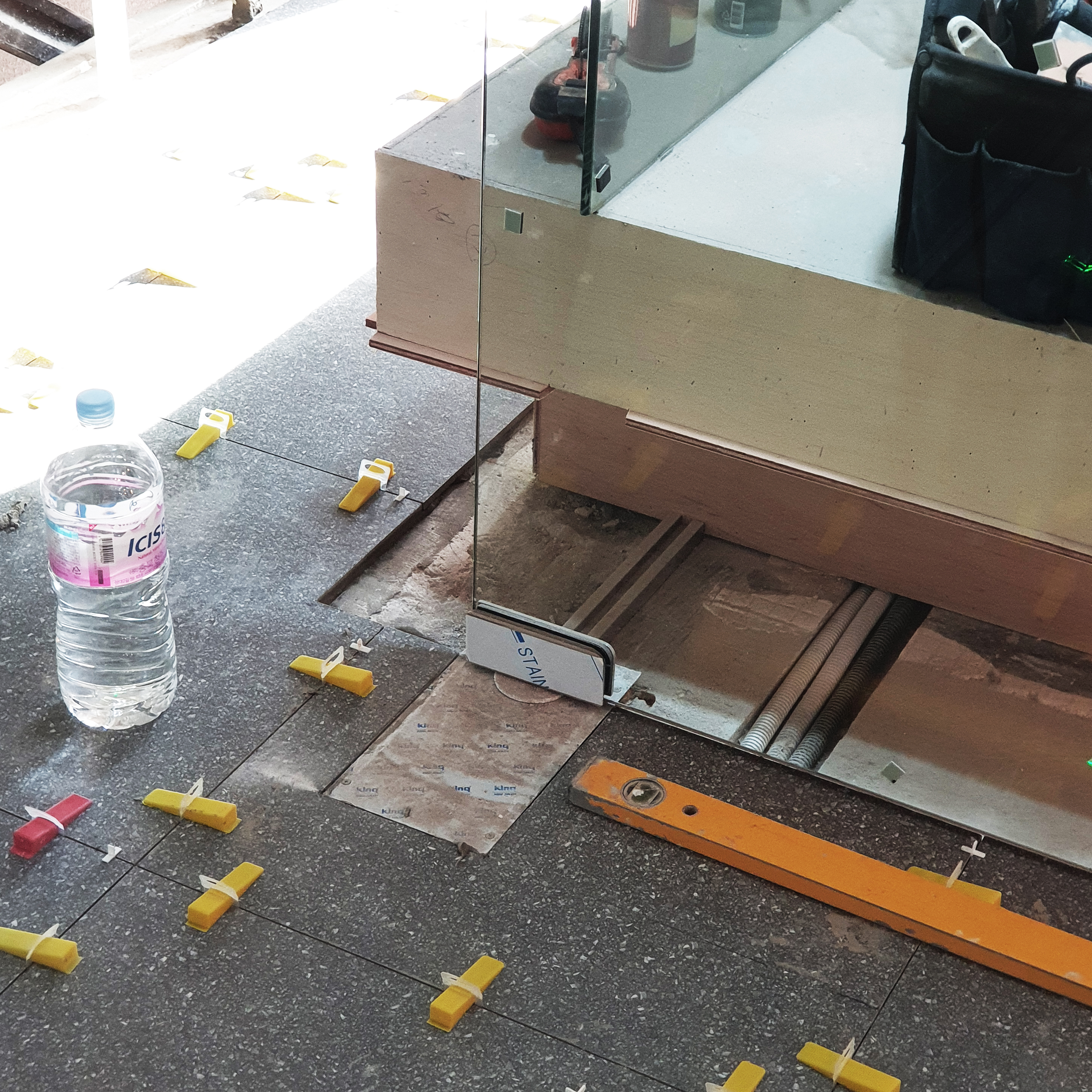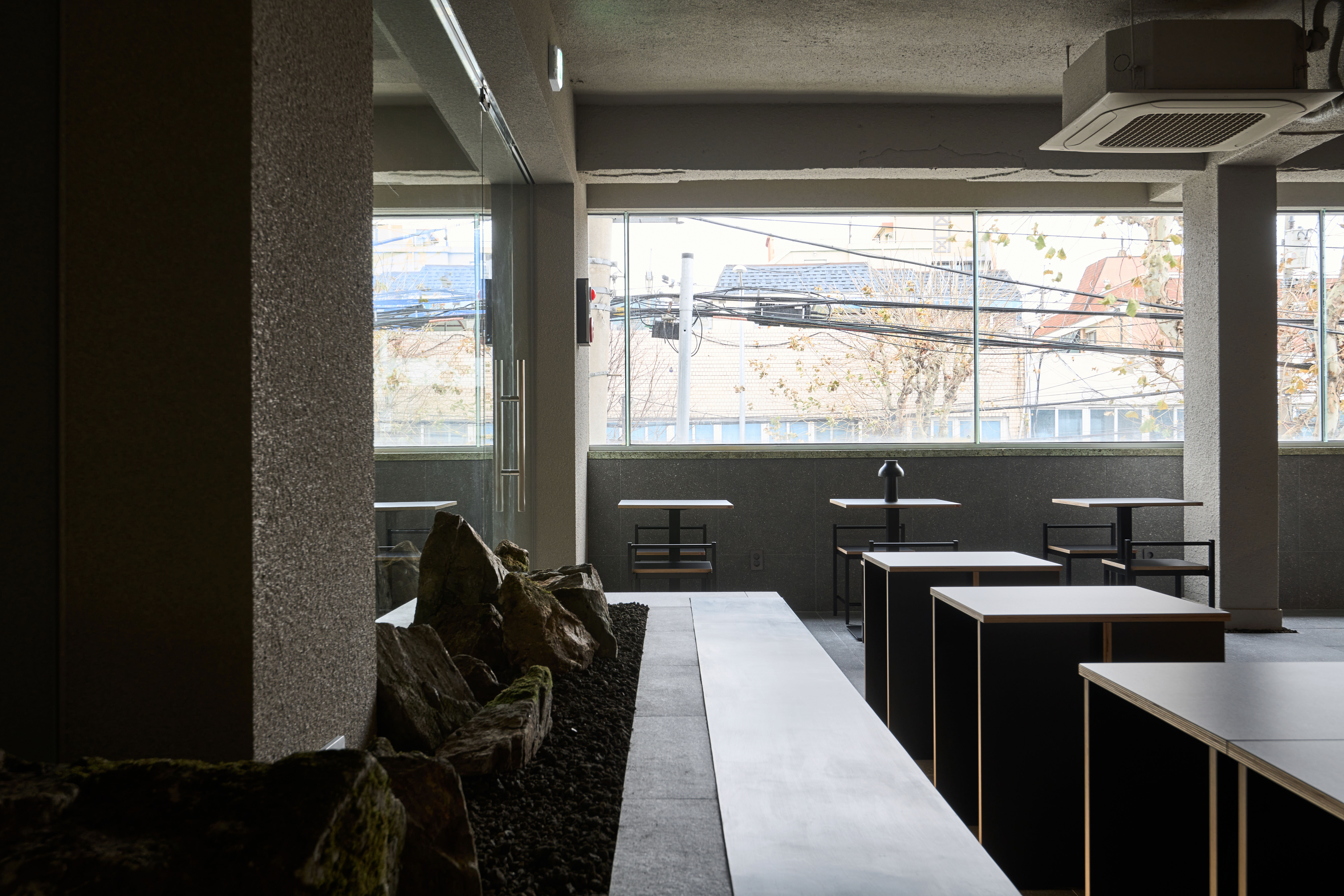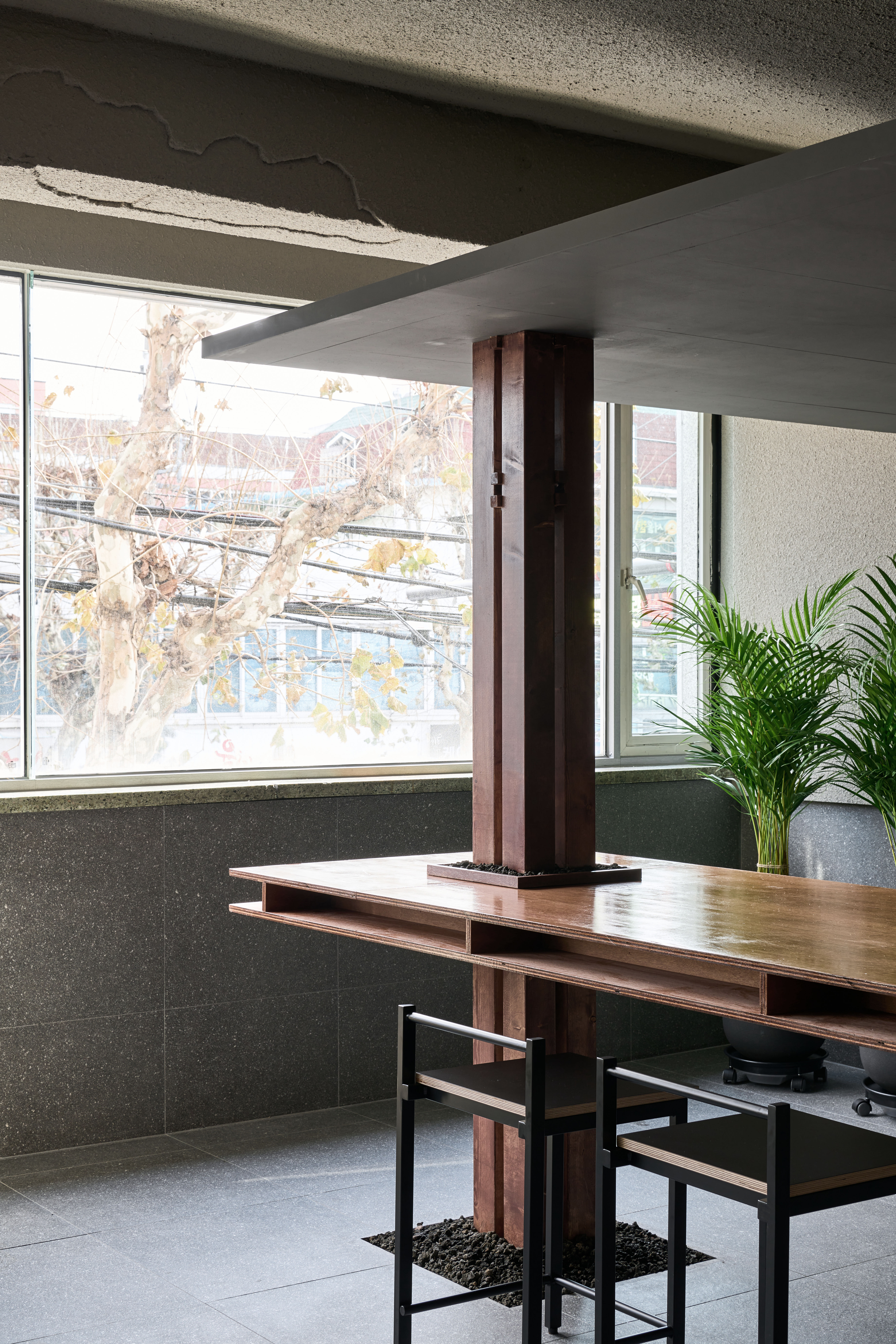 무채색 돌로 된 공간에 길게 놓인 나무와 지붕으로 이루어진 커피바.