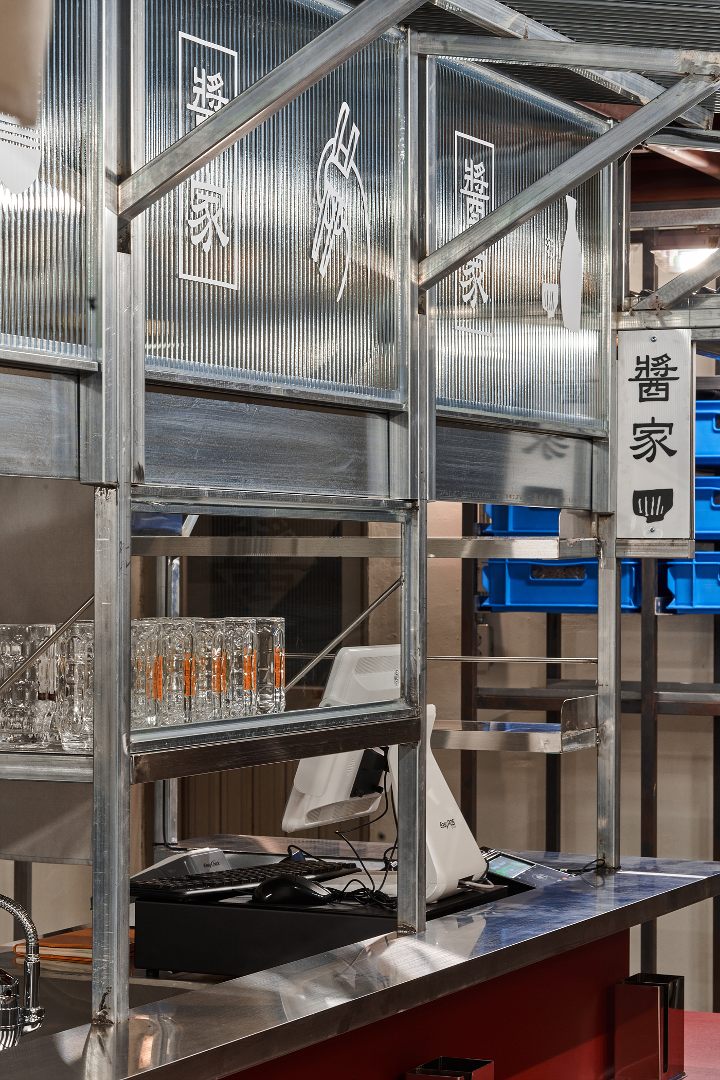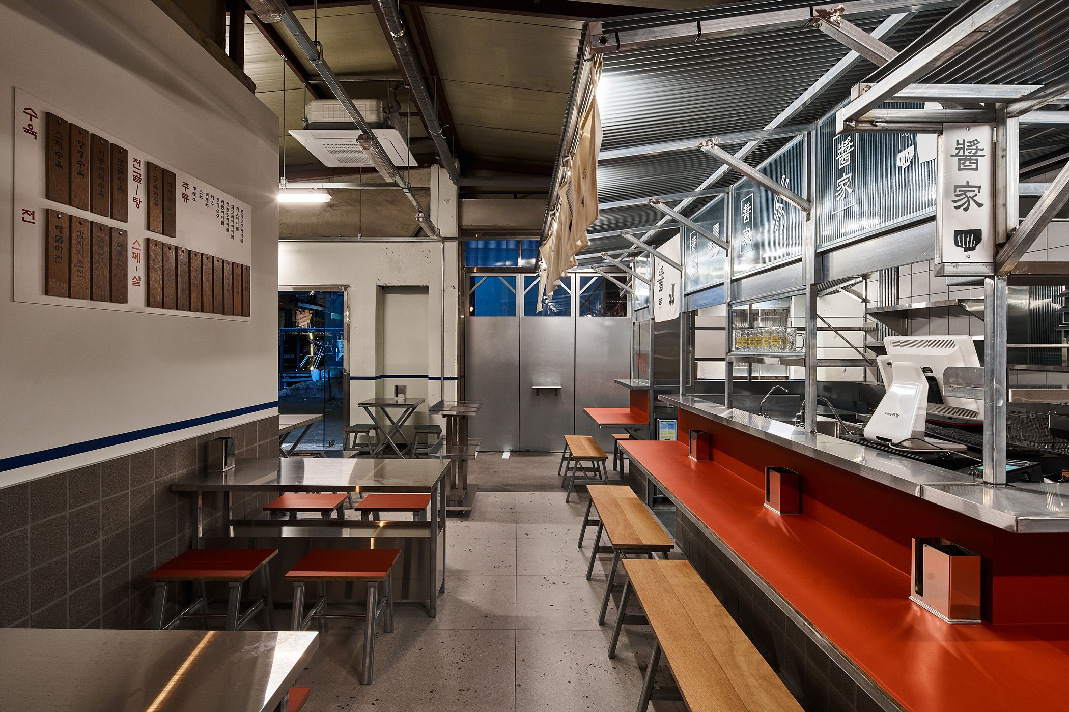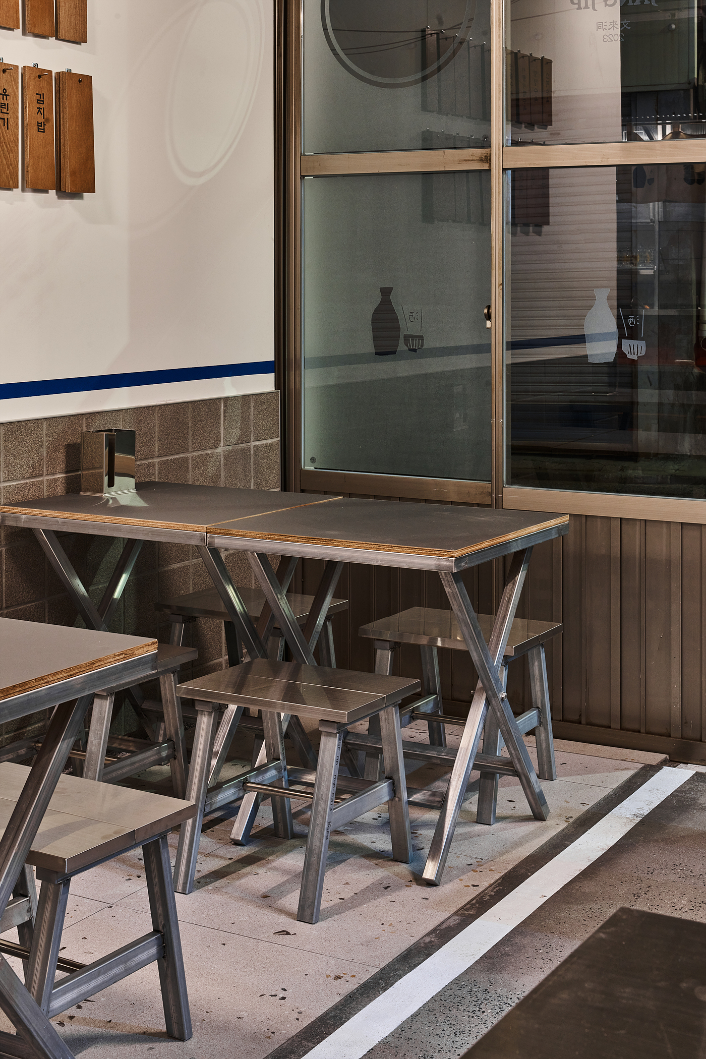 문래동의 분위기를 나타낼 수 있도록 대부분의 구조물은 금속을 절곡, 절단하여 제작 했습니다. 테이블 색깔과 사인물도 채도가 낮은 칼라를 사용했습니다. 주 출입문은 기존에 사용되던 알루미늄 문을 고쳐서 사용합니다. 보조 출입문은 주변 공장에서 흔히 사용되는 형태를 참고하여 제작했습니다. 나머지 출입문은 슬레이트지붕을 만들어 비가 올 때 지붕에 비가 떨어지는 소리를 들을 수 있을 겁니다.