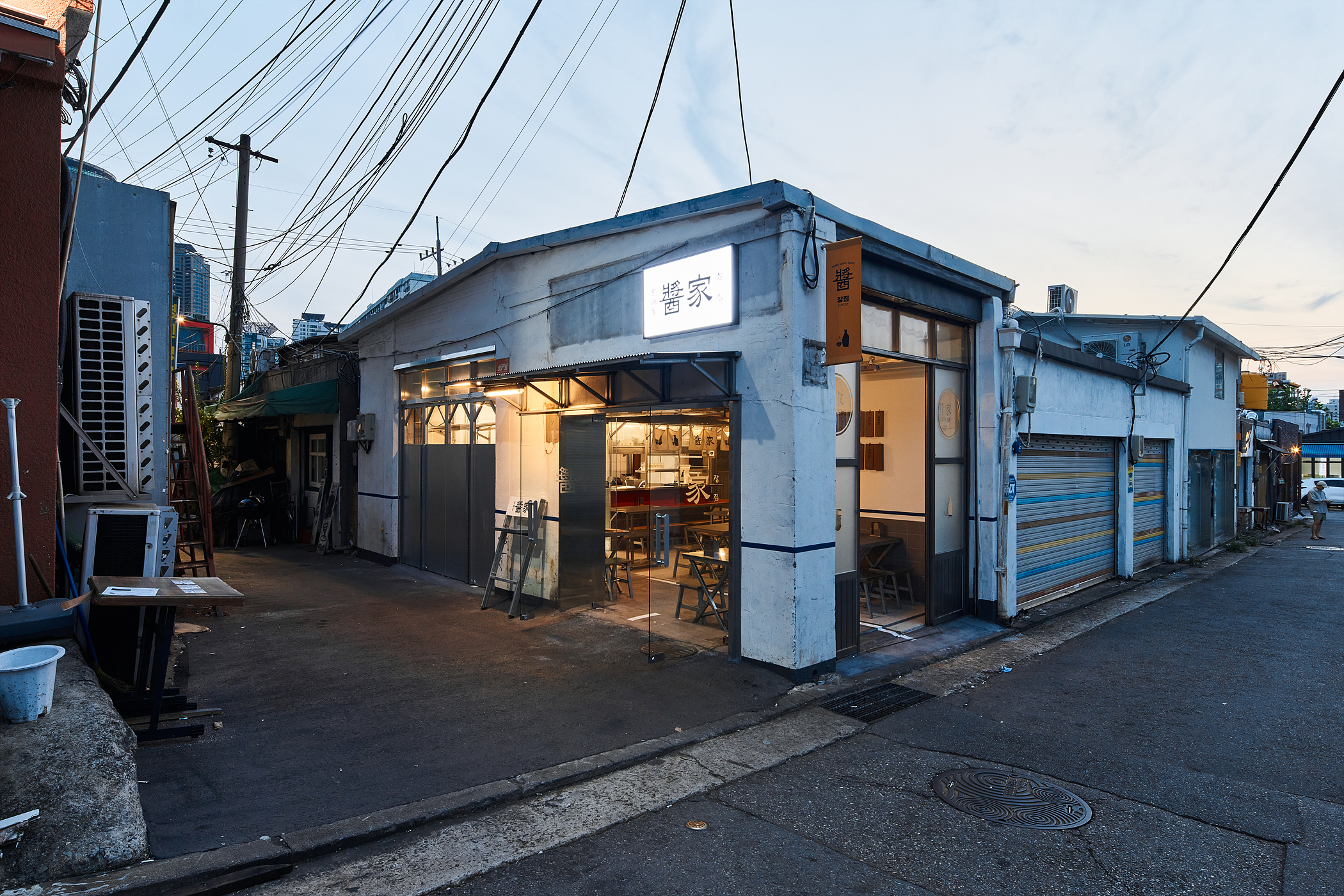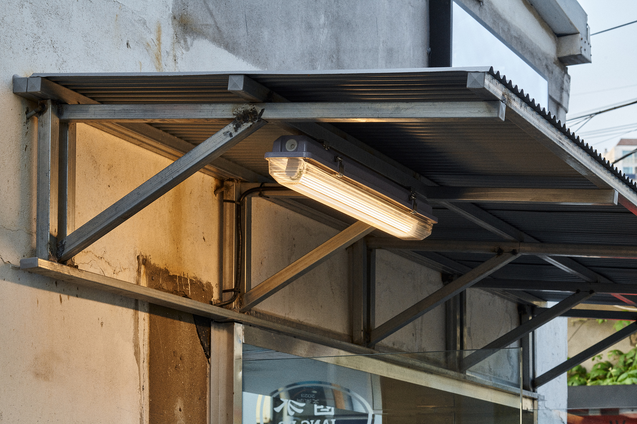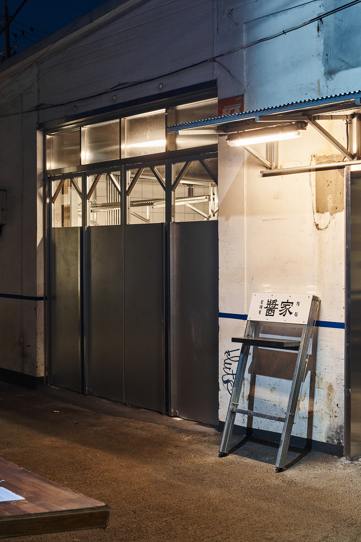 사이트는 서울의 문래동입니다. 이 프로젝트는 동네 분위기를 따라 시작되었습니다. ‘문래’는 금속 성형 공장들이 밀집되어 있어 특유의 분위가 느껴집니다. 천장고가 높은 공장 건물, 금속판을 접어서 만든 거대한 문, 채도가 낮은 빨강 파랑 초록의 사인물에서 공통된 특징들이 보입니다. 이러한 요소들이 문래동 특유의 산업적이고 레트로한 감성을 만들어 냅니다.