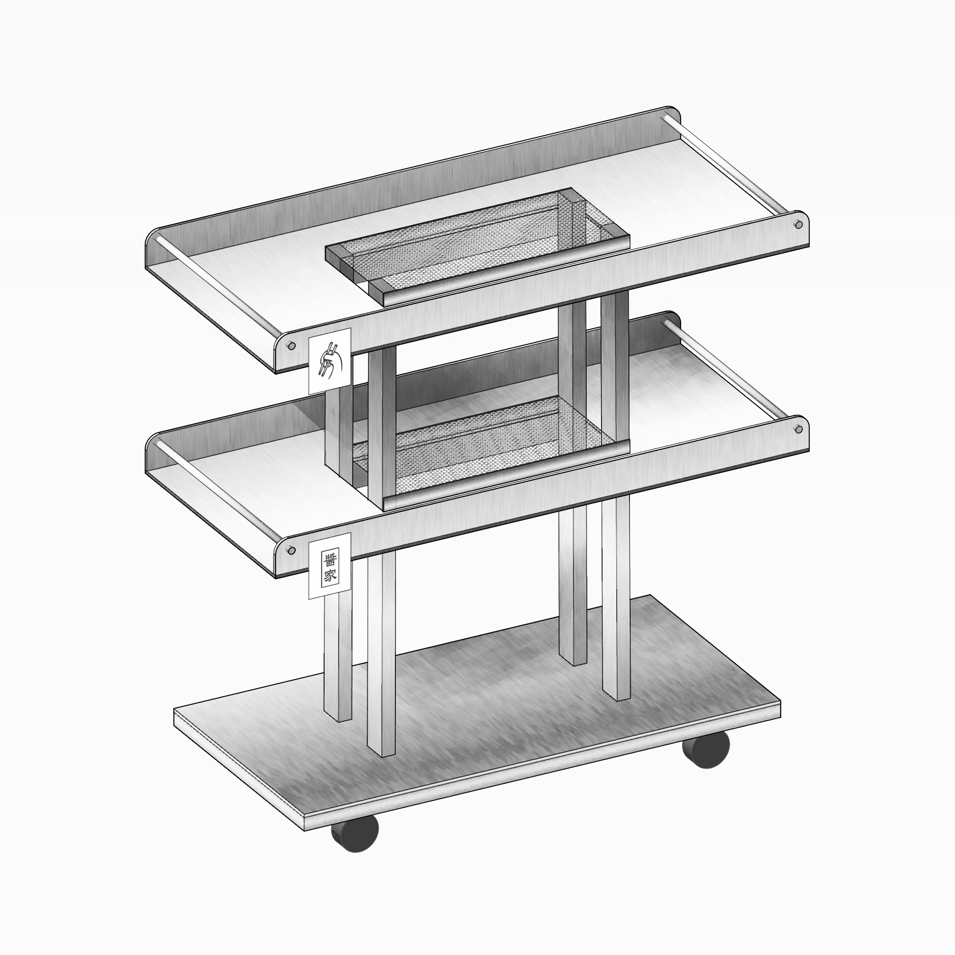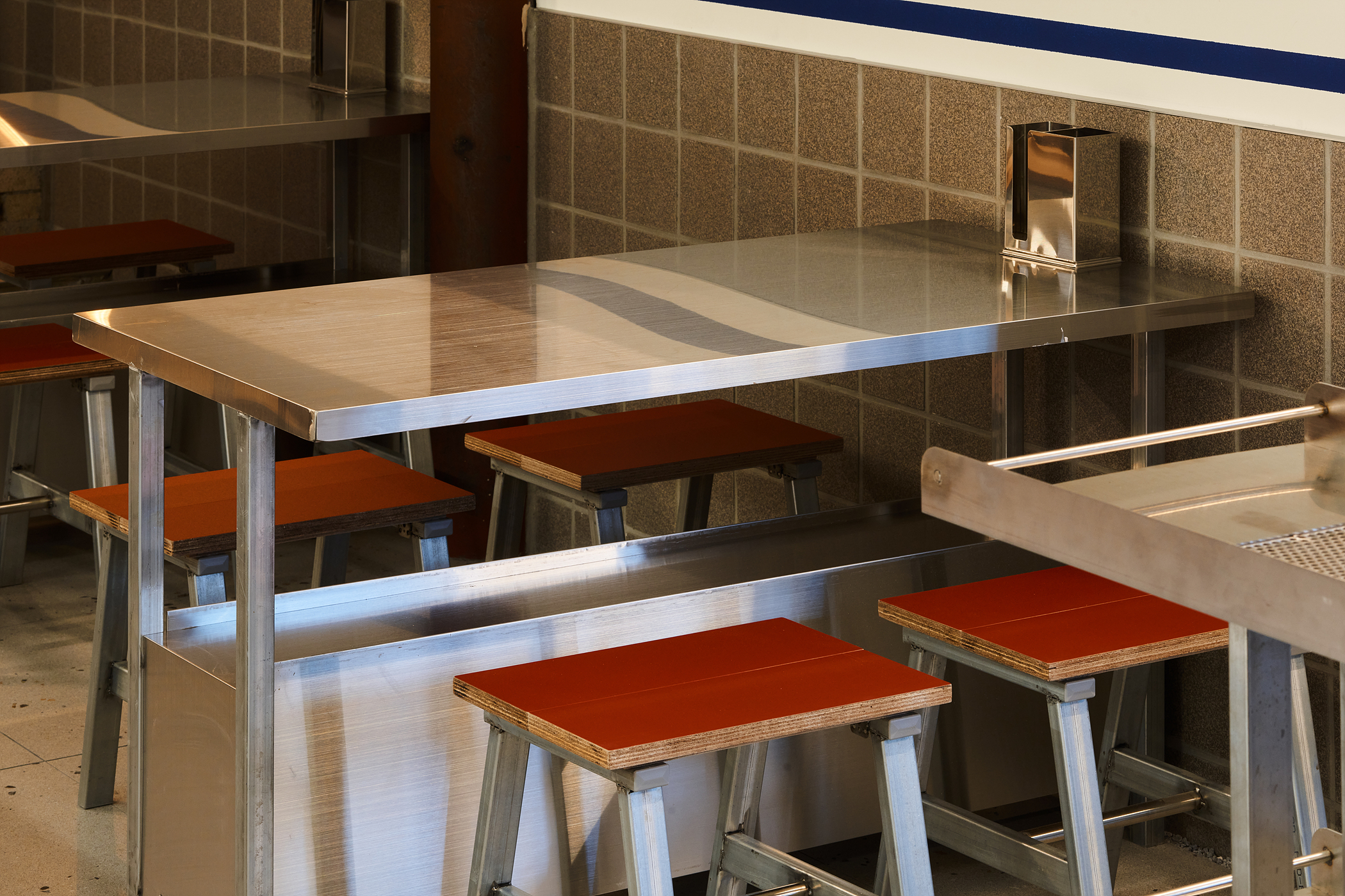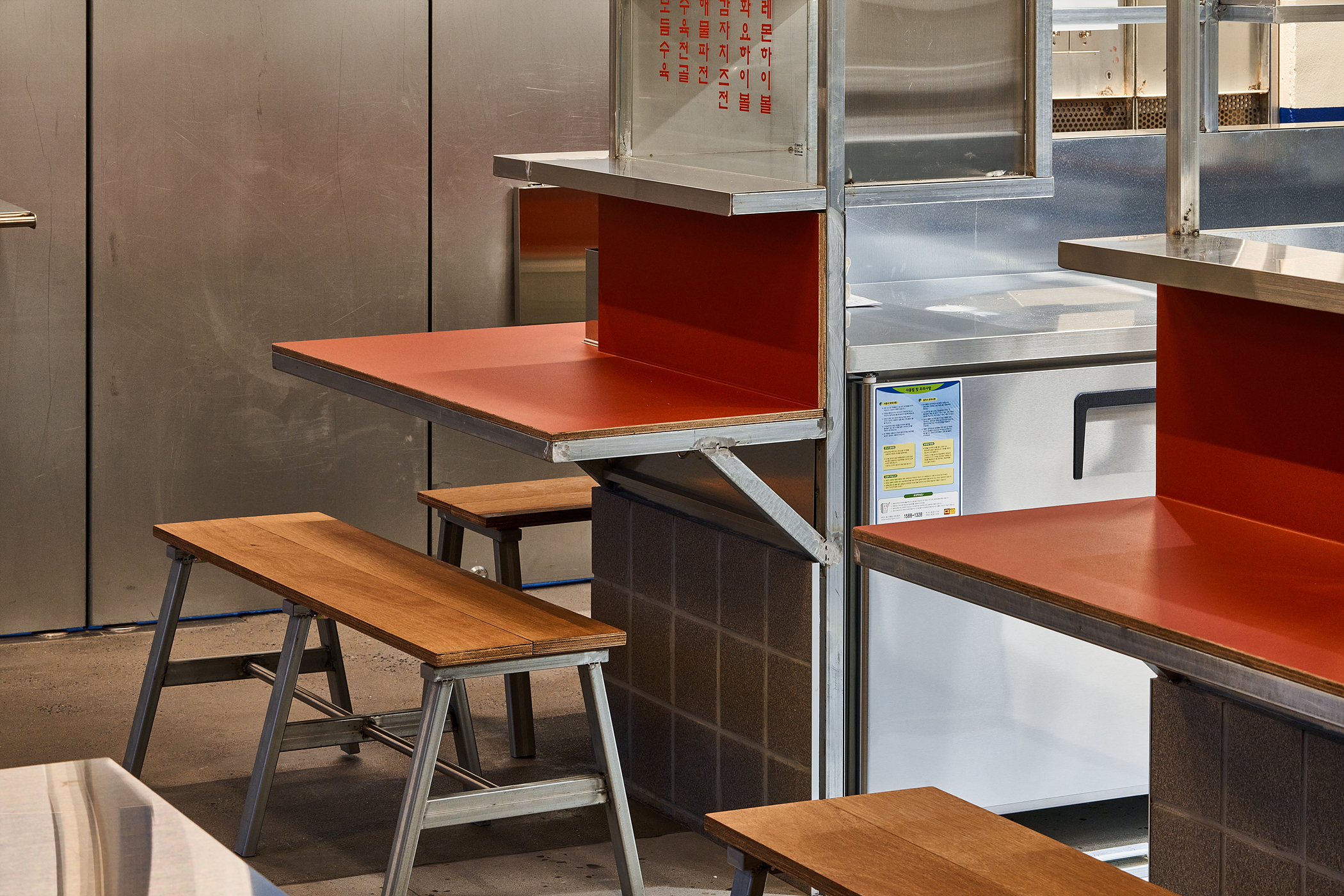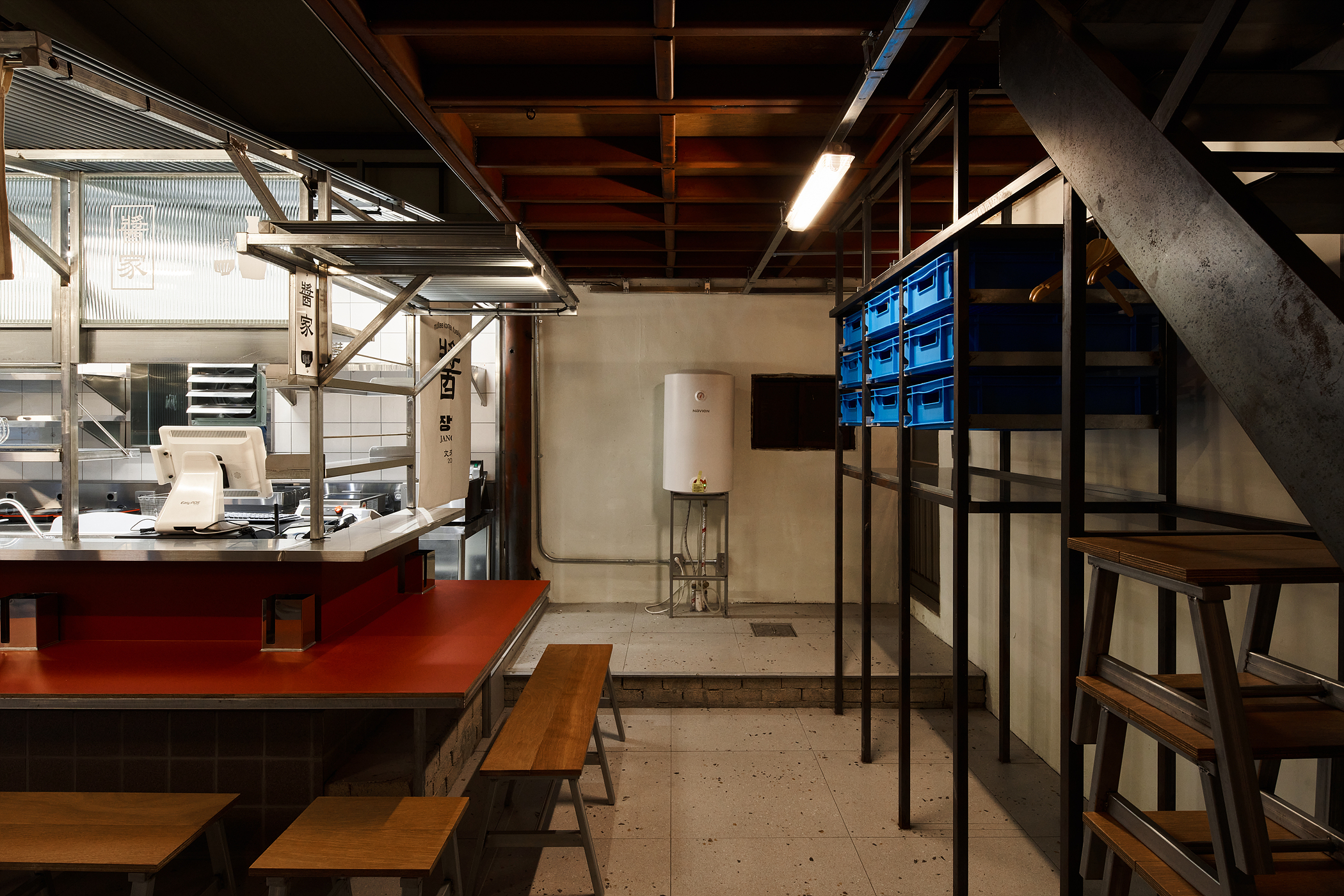 가구는 자유로운 배치를 위해 평소에는 쌓아 놓을 수 있도록 디자인 되었습니다. 테이블 또한 다리를 엑스자로 자작하여 접어서 놓을 수 있습니다. 야외에서 흔히 쓰이는 플라스틱 테이블에서 영감을 받았습니다. 문래에서 포장마차가 시작되었으면 어떤 모습일까라는 초기의 물음은 동네의 분위기를 자연스럽게 받아드려 완성되었습니다.