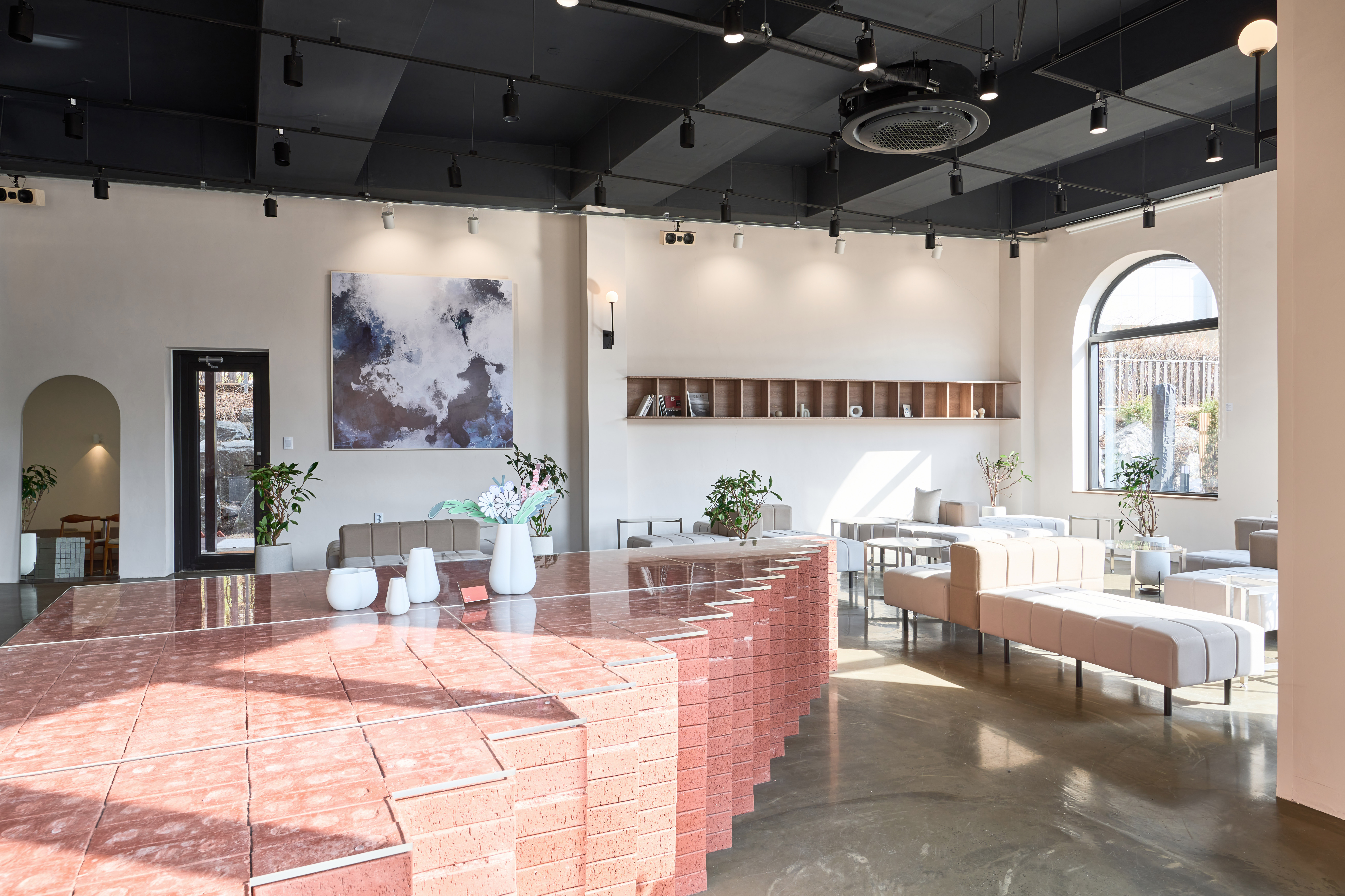 대각선 평면을 자연스럽게 나누기 위해 붉은벽돌로 이루어진 삼각형의 대형 테이블을 중앙에 설치하고 그 주변으로 각자 다른 분위기를 갖는 세영역을 만든다.