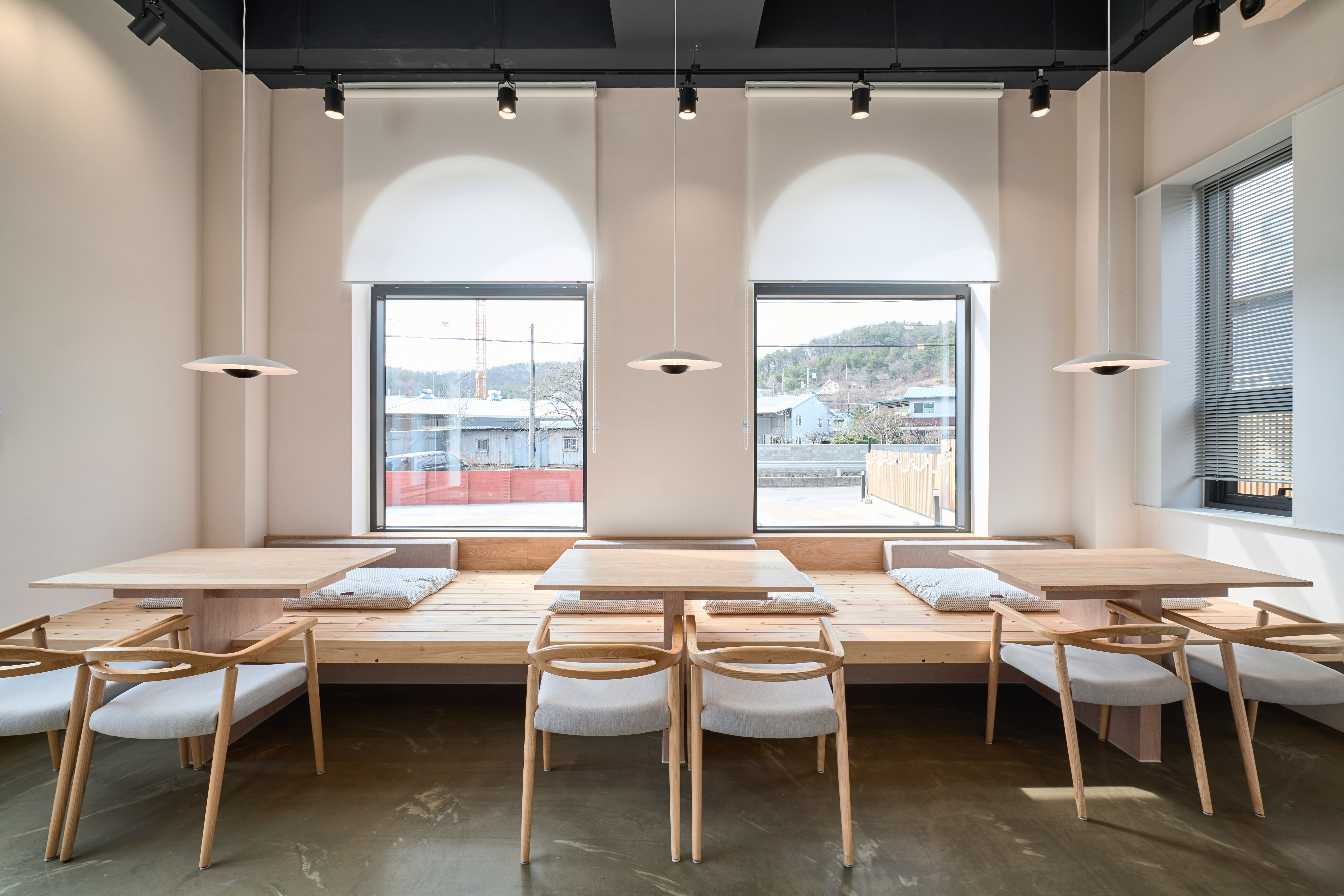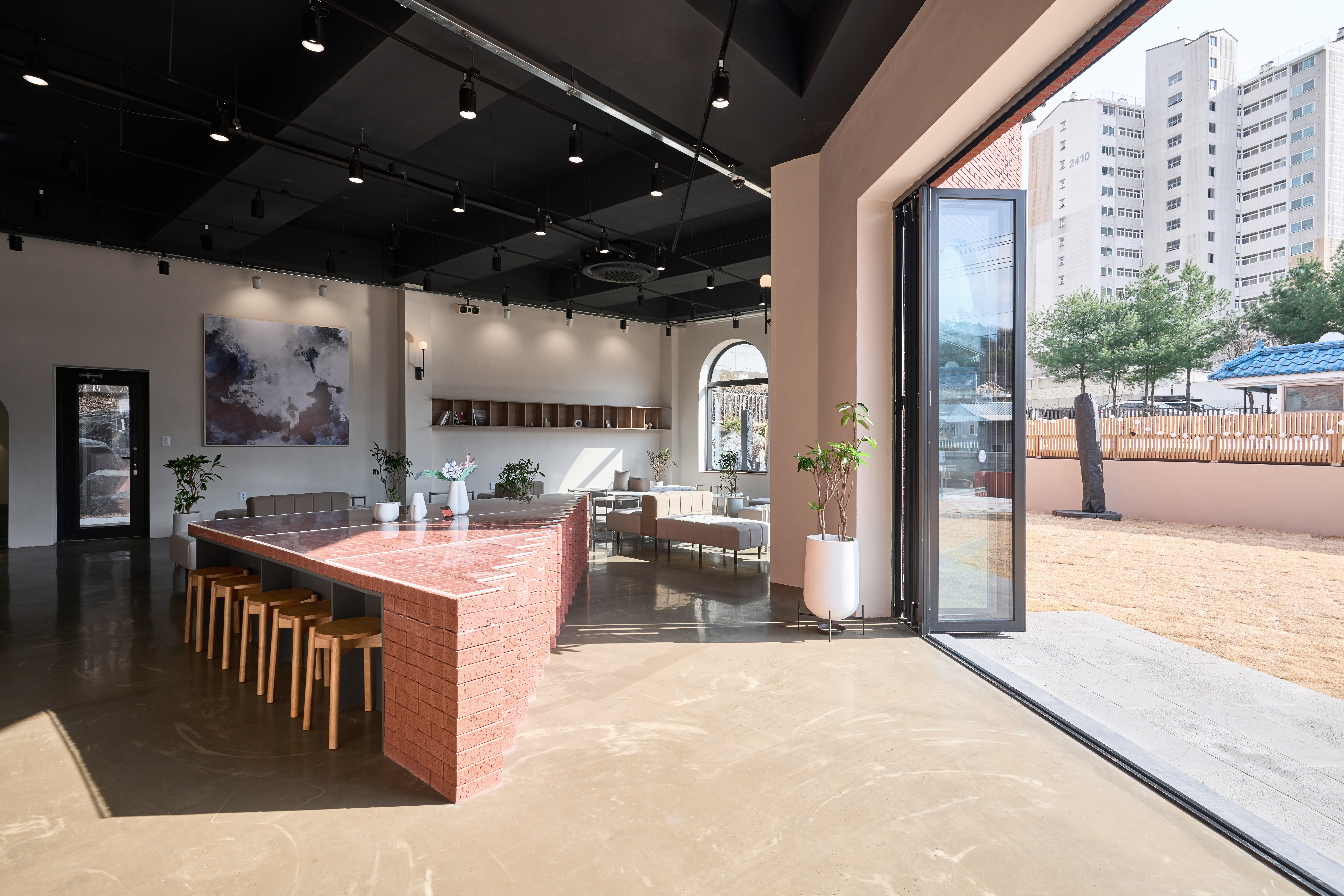 대각선으로 지어진 붉은벽돌 건물은 중앙 카운터를 중심으로 3개의 공간이 만들어진다.