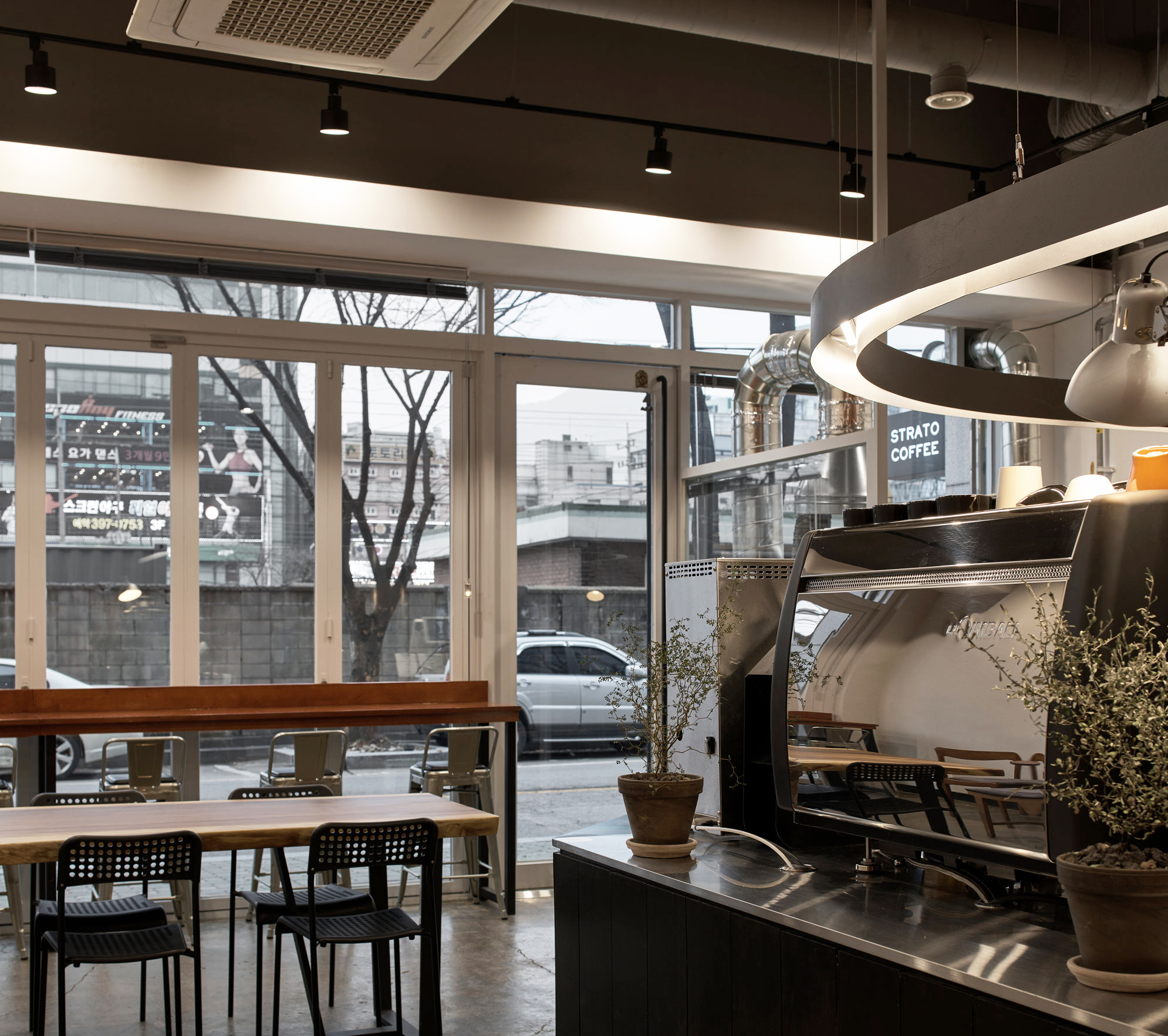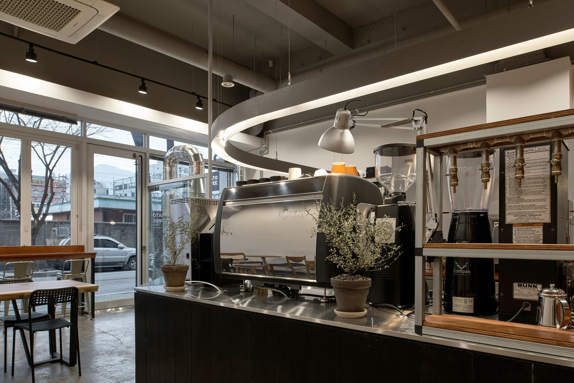가공된 금속과 시멘트 같은 산업적 느낌의 재료와 여러 방식으로 마감된 나무재료들은 내부 로스팅실에서 외부 환경까지 조화를 이루는 태도를 취한다.