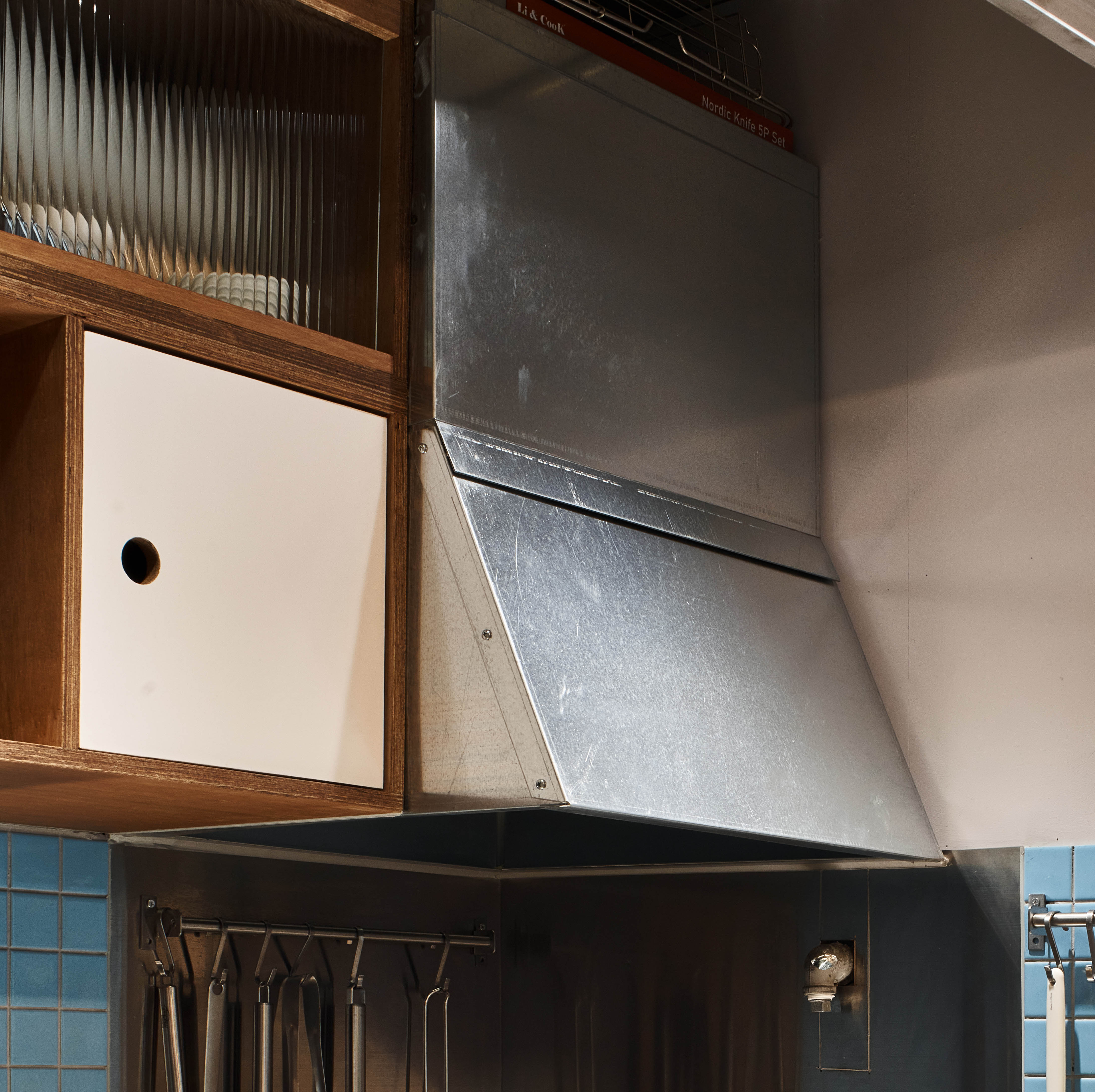 이것은 재료전시 선반의 끝, 씽크대 손잡이, 주방후드의 형태에서 나타납니다. 불투명하거나 반사되는 재료는 공간을 풍부하게 하고 틈새와 구멍들은 공간의 깊이를 줍니다.
