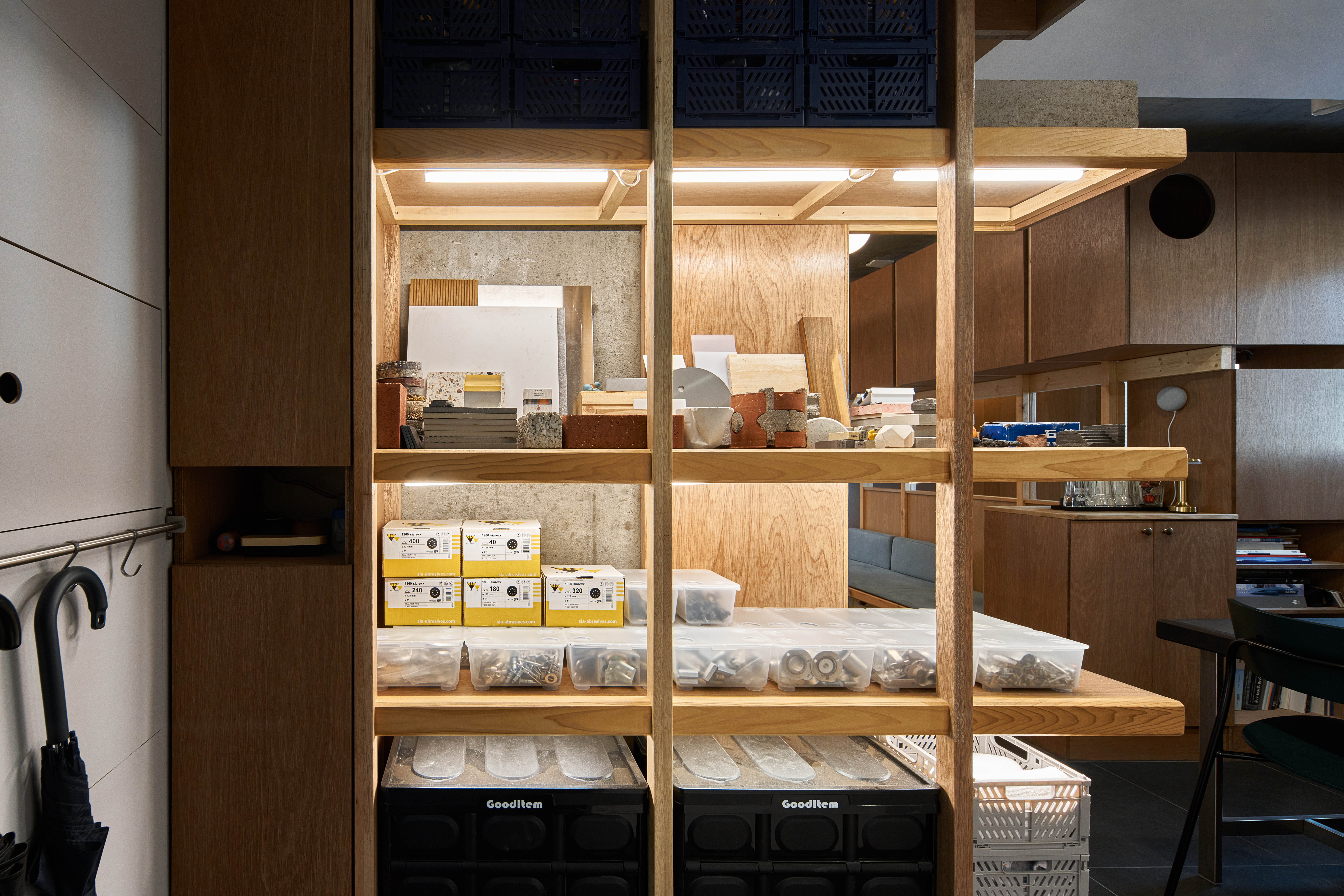 여러 기능이 좁은 평면 안에 들어가기 위해 입체적인 형태의 붙박이 가구가 계획되었습니다.